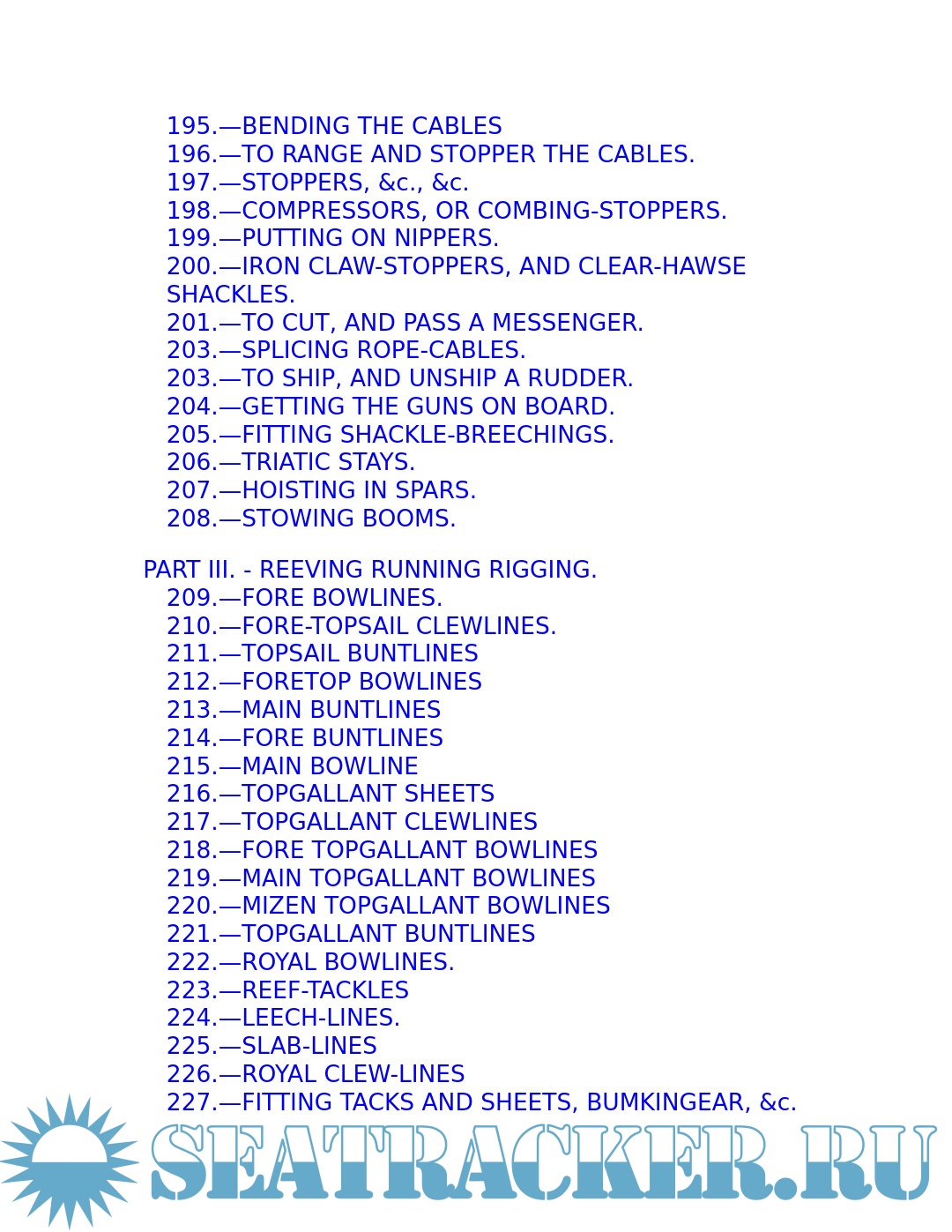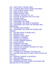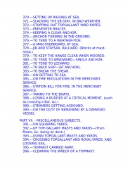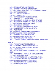 The young sailor learns about stowing provisions, driving before the wind. Securing the ship for sea, and setting and shifting course. He also learns what to do in the extremities of life at sea: how to unbend a topsail in a gate and how to prepare for a hurricane; what to do if the tiller breaks, the mainmast is carried away, or the ship leaks faster than the pumps can free her. Detailed instructions explain procedures for dealing with fires, squalls, and waterspouts, what to do when the main rigging is shot away by an enemy or when a man has fallen overboard, and how to abandon ship and take to the boats when necessary.