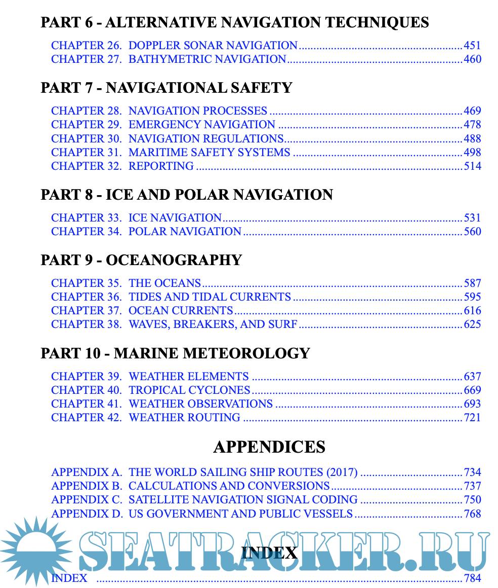 PART 7, NA VIGA TIONAL SAFETY , discusses recent developments in management of navigational resources, the changing role of the navigator, distress and safety communications, procedures for emergency naviga- tion, and the increasingly complex web of navigation regu- lations.