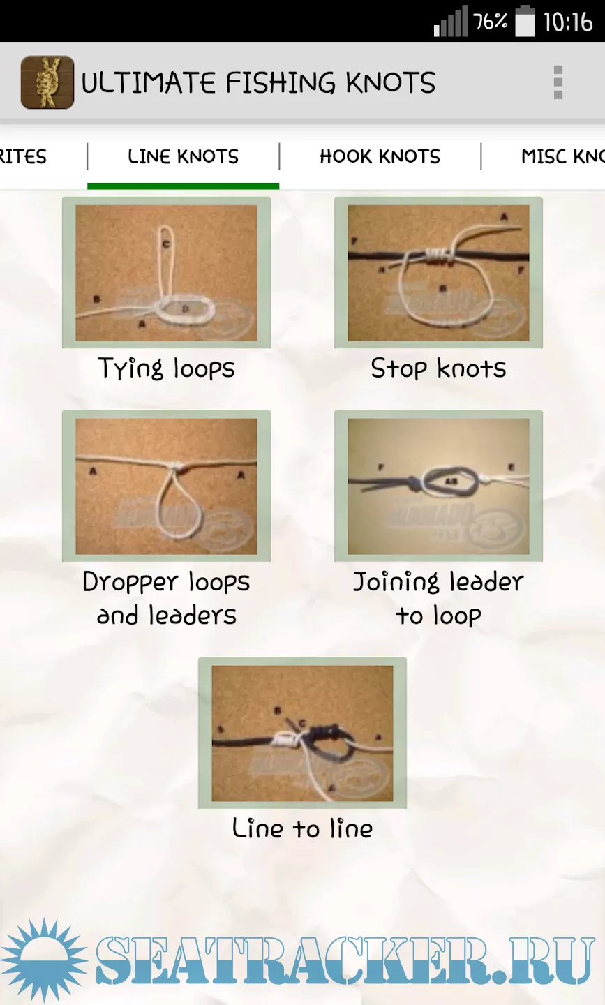 This application illustrates how to make the most popular fishing knots, categorized in 4 chapters: line, hook, misc and boating knots. Step-by-step instructions help anyone to master those.
