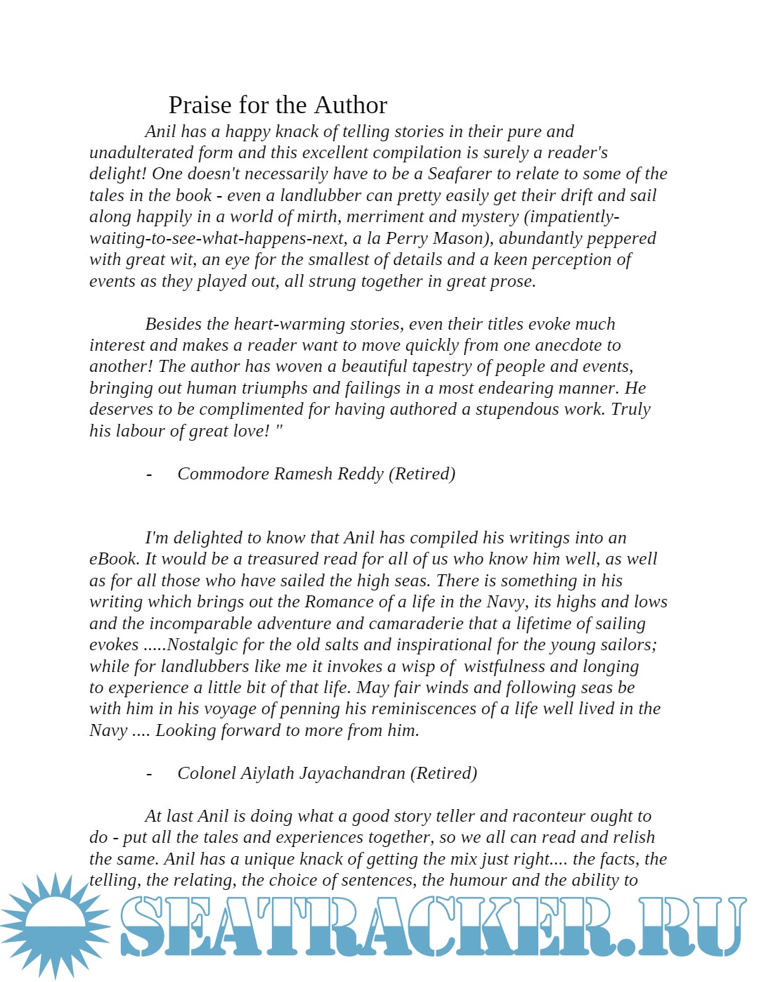 Year: 2020 Language: English Author: ANIL GONSALVES Genre: Fiction Format: PDF Quality: eBook Pages count: 136 Description: This book is a collection of fictional anecdotes referring to my time spent at the National Defence Academy, the Indian Navy and post retirement from the Navy. The anecdotes are not contiguous. Therefore, they can be read in any order. I've used hyperbole extensively to accentuate humour. The characters and events in this book are fictional and are purely figments of my own imagination. Additional info: About the author: Captain Anil Gonsalves studied in St Francis D’Sales School,Nagpur and St Vincent’s School Pune, India. He joined the 54th Course at the National Defence Academy, Khadakvasla, Pune, India and passed out from the hallowed portals of this Institution in June 1978. He served on various Indian Naval Ships ranging from Landing Craft Utility, Landing Ship Tank, Missile boats, ASW Patrol Vessels and ASW Frigates and completed his Staff College Course in 1994. He commanded CGS Rajshree and INS Mahish. He specialised in Anti-Submarine Warfare and was Instructor and Chief Instructor of ASW School, Kochi. He also served as Fleet Anti-Submarine Warfare Officer, Eastern Fleet and Staff Officer ASW at Maritime Warfare Centre in Mumbai, before leaving Service in 2005.