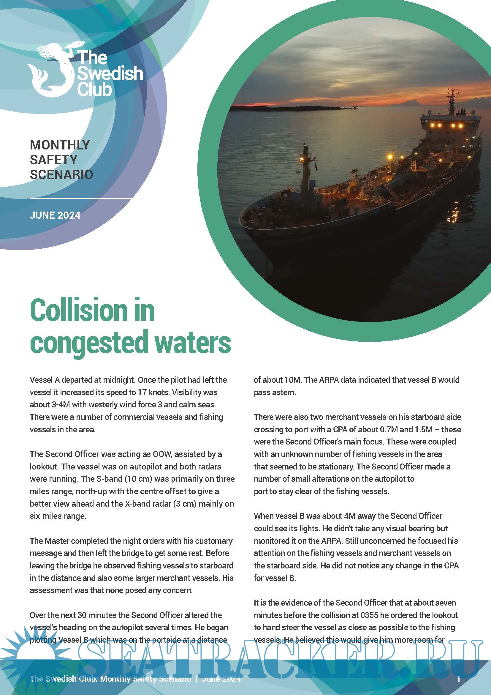 Year: 2024 Language: English Author: the Swedish Club Genre: Periodical publication Edition: June - August, 2024 Format: PDF Quality: eBook Pages count: Multiple Description: The Club is publishing, on a monthly basis, a new Monthly Safety Scenario (MSS) to assist owners in their efforts of complying with the above regulations. Alternative scenarios will be uploaded in SCOL. It is easy to download the MSS and enter the written conclusions from the meeting and send feedback to the shore-based organisation. Under the ISM requirement, owners are obliged to carry out monthly safety meetings or safety committee meetings onboard their vessels. This obligation stems from Chapter 5 of the ISM Code: “Master’s responsibility and authority” and furthermore from “5.1.2, motivating the crew in the observation of that policy” see "Contents" for details.