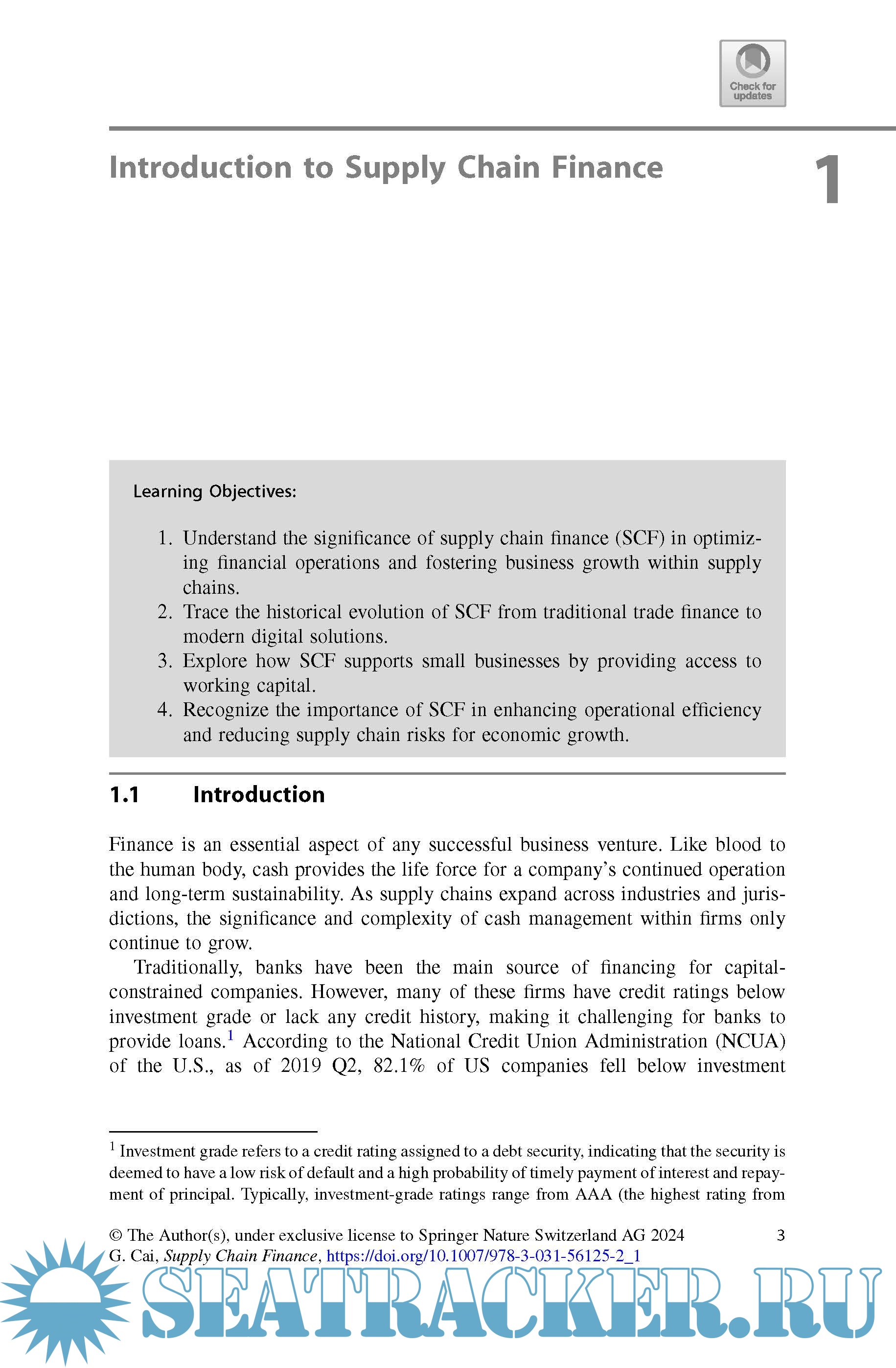 Year: 2024 Language: English Author: Gangshu Cai Genre: Textbook Publisher: Palgrave Macmillan Edition: 2024th edition (September, 2024) ISBN: 9783031561252 Format: PDF Quality: eBook Pages count: 537 Description: As global supply chains become more complex, the need for expertise in their financial aspects grows. This book aims to equip students and professionals with the knowledge to navigate these complexities, ensuring efficient and resilient financial supply chain operations. It provides an in-depth exploration into the intricate and constantly evolving realm of supply chain finance. By merging key concepts, major mechanisms, hands-on risk analytics, and the latest technology trends, this book offers a seamless and comprehensive examination of the topic, grounded in the author's twenty years of academic research and hands-on experience. Students in supply chain management will gain a thorough understanding of the financial elements that are integral to modern supply chains, including the importance of liquidity, the role of financial institutions, and the optimization of cash flows within the supply chain ecosystem. Definitions will be used throughout the text to elucidate financial terminology that may be unfamiliar to management students. The instructor’s manual will include PowerPoint slides, exercises, and quizzes to assess student comprehension and progress. This textbook will serve as the primary resource for understanding the financial dimensions of supply chains.