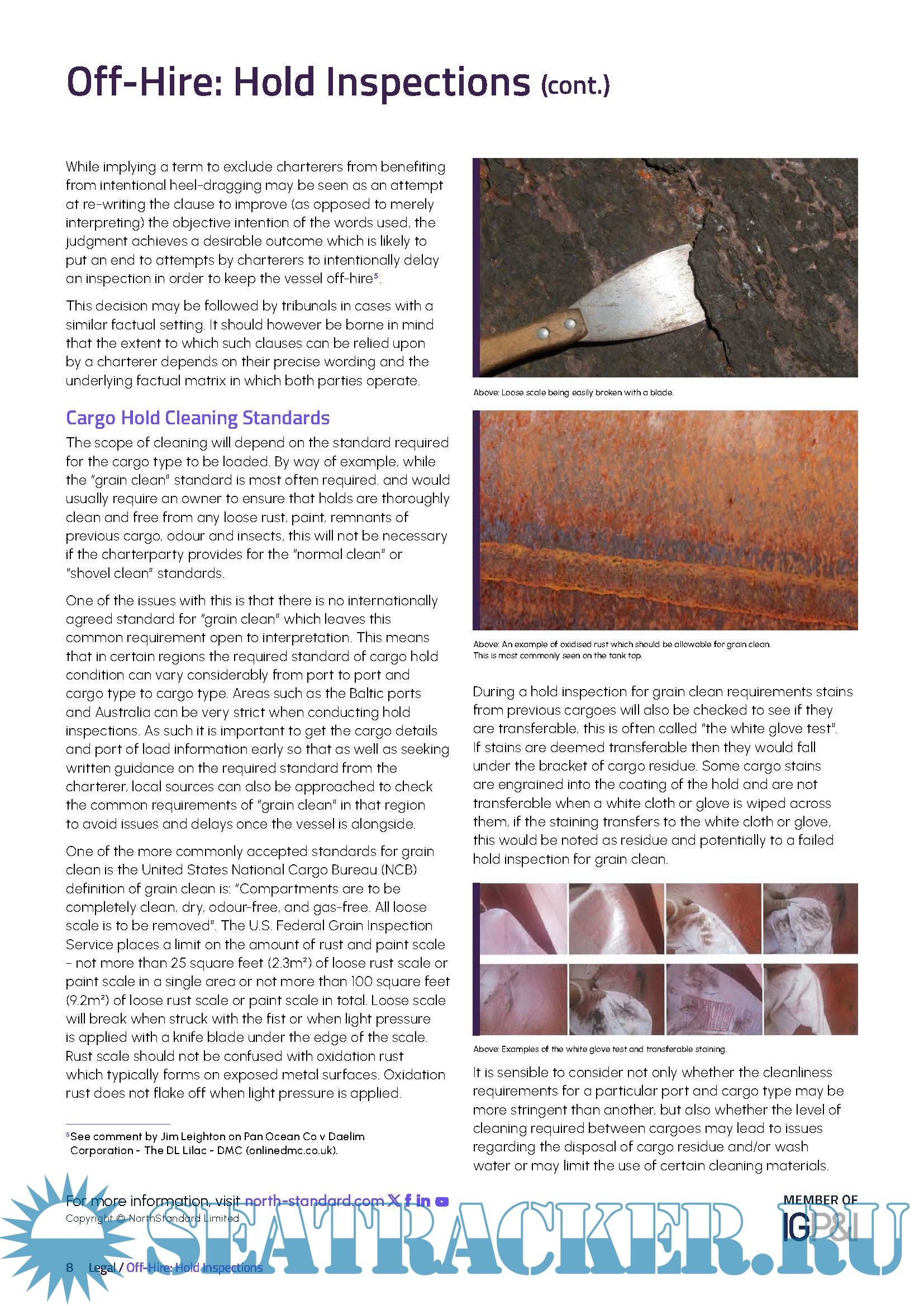 Year: 2024 Language: English Author: NorthStandard Genre: Practical guide Edition: September 2024 Format: PDF Quality: eBook Pages count: 11 Description: It is common for the parties to agree on terms in time charters which allow a charterer to place a vessel off-hire for a specific period of time as a result of a failed hold inspection on delivery or prior to loading the first cargo. Such clauses constitute an exception to a charterer’s general obligation to pay hire continuously and will often stipulate certain conditions that must be met before the vessel is rendered off-hire. This briefing provides guidance for owners and charterers on such clauses, addressing both (1) the mechanics of determining an off-hire period; and (2) the standards of cleanliness required to pass inspection, if a potential off-hire period as a result of an inspection failure is to be avoided.