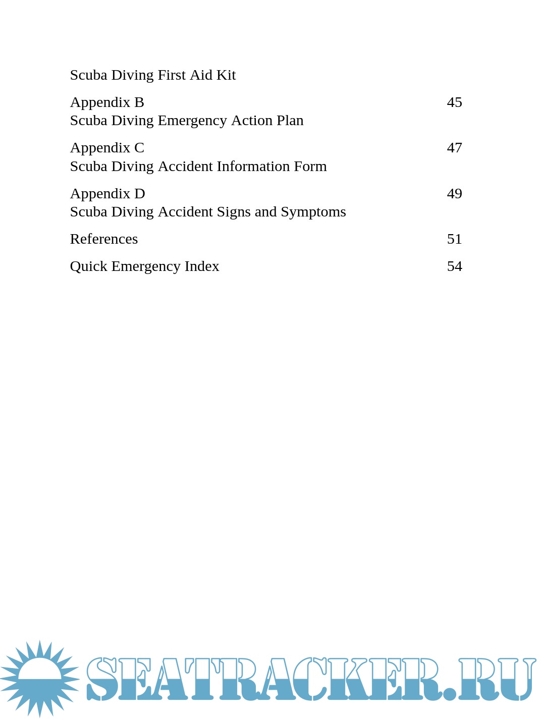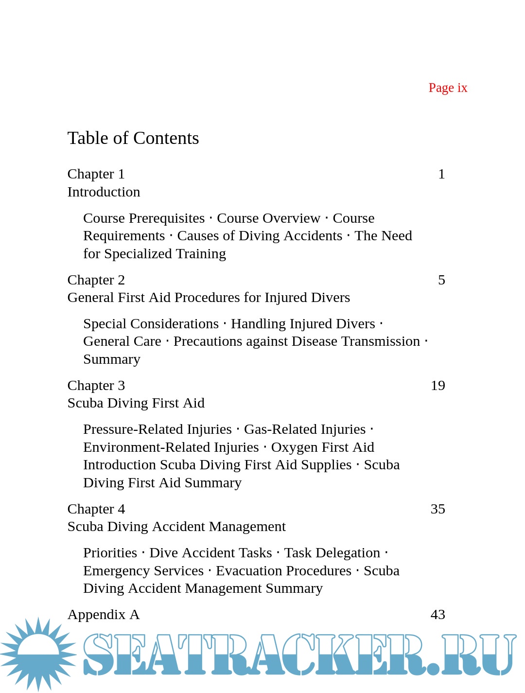 Year: 1996 Language: English Author: National Safety Council Genre: Manual Publisher: Jones & Bartlett Publishers, Inc. Format: PDF, EPUB Quality: eBook Pages count: 166 Description: By the end of this course you should be able to: · Score 80% or higher on a comprehensive scuba diving first aid written examination · Demonstrate the techniques for handling, moving, and positioning people who simulate injured scuba divers, including those with suspected neck injuries · Demonstrate the procedures for the secondary survey of an injured scuba diver · Demonstrate scuba diving accident management techniques, including the delegation of at least ten emergency action tasks