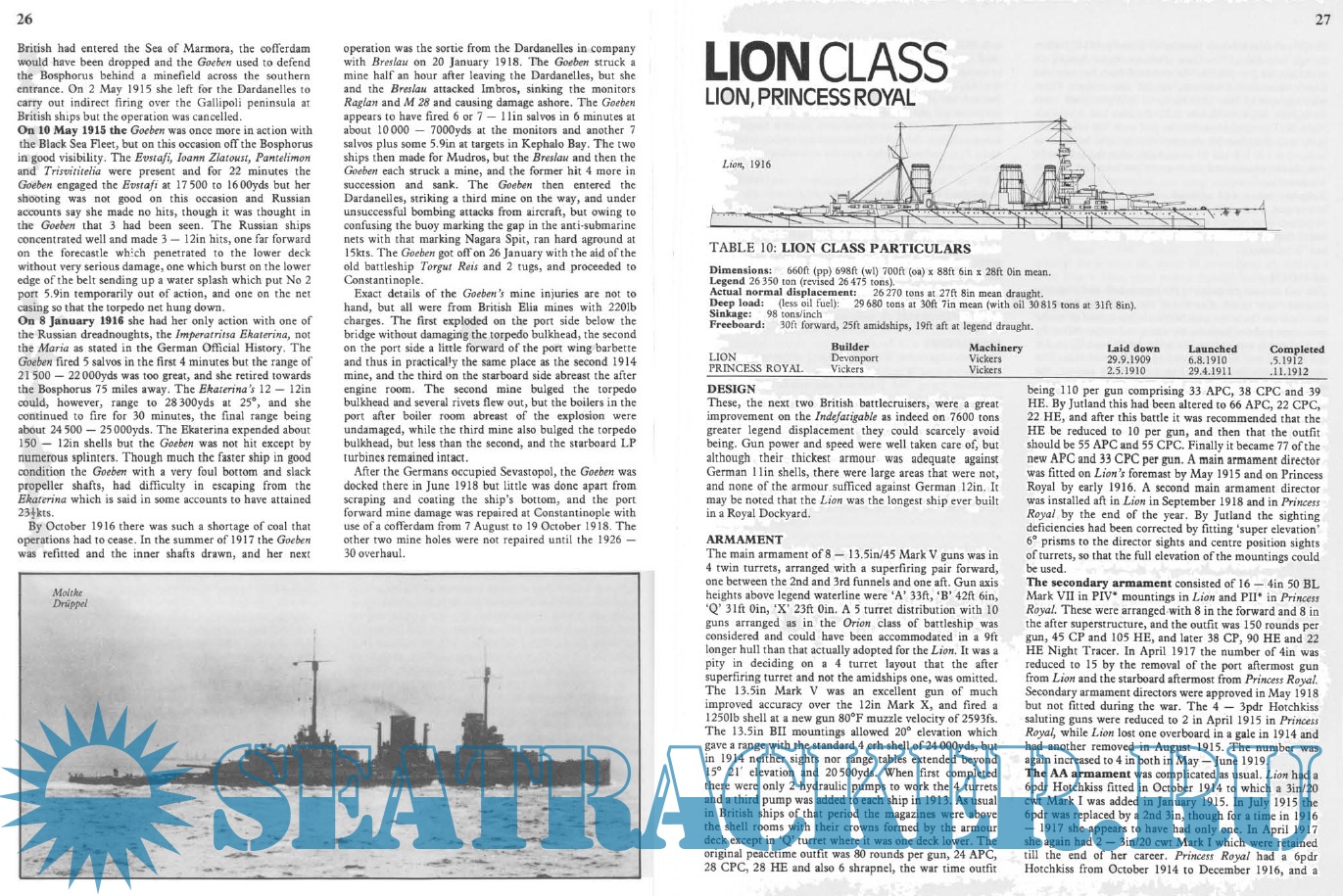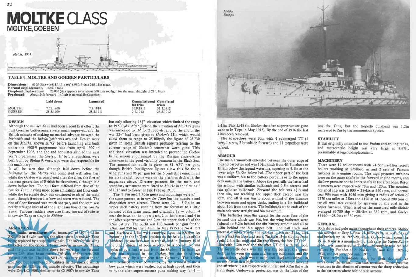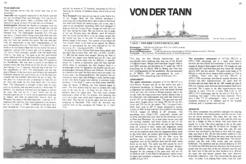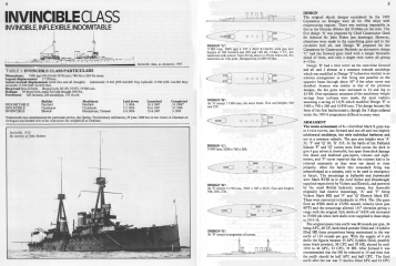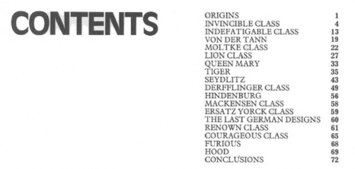 Description: This is a booklet on the British and German battlecruisers of the WW I era. The text describes the design development histories of the various classes of ships. The text is accompanied by numerous black and white photos and a few line drawings of the ship longitudinal profiles but no deck plans. There are short tabulations of dimensions and displacements; unfortunately, these tabulations do not include subjects such as armament, armor thicknesses, and machinery horsepower and speed. Those subjects are discussed in detail in the text. There is a subsection on “War Service” for each class in which the ship’s battle actions and damage incurred or sinking are described. The booklet also includes the last German battlecruiser classes of 1915 – 1918 which were designed, and in some cases started construction, but were never completed.