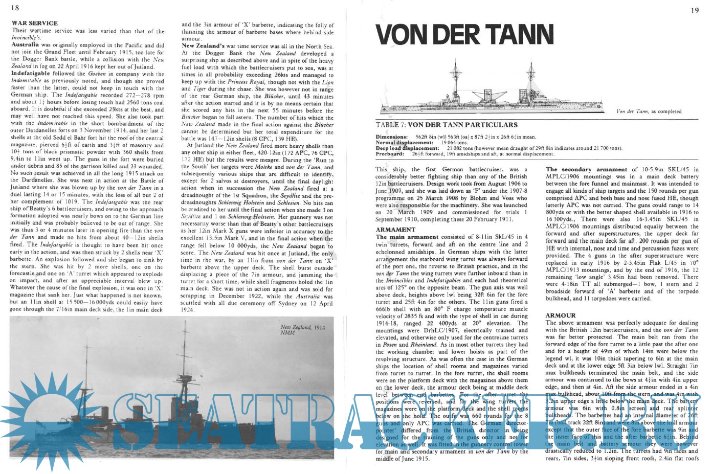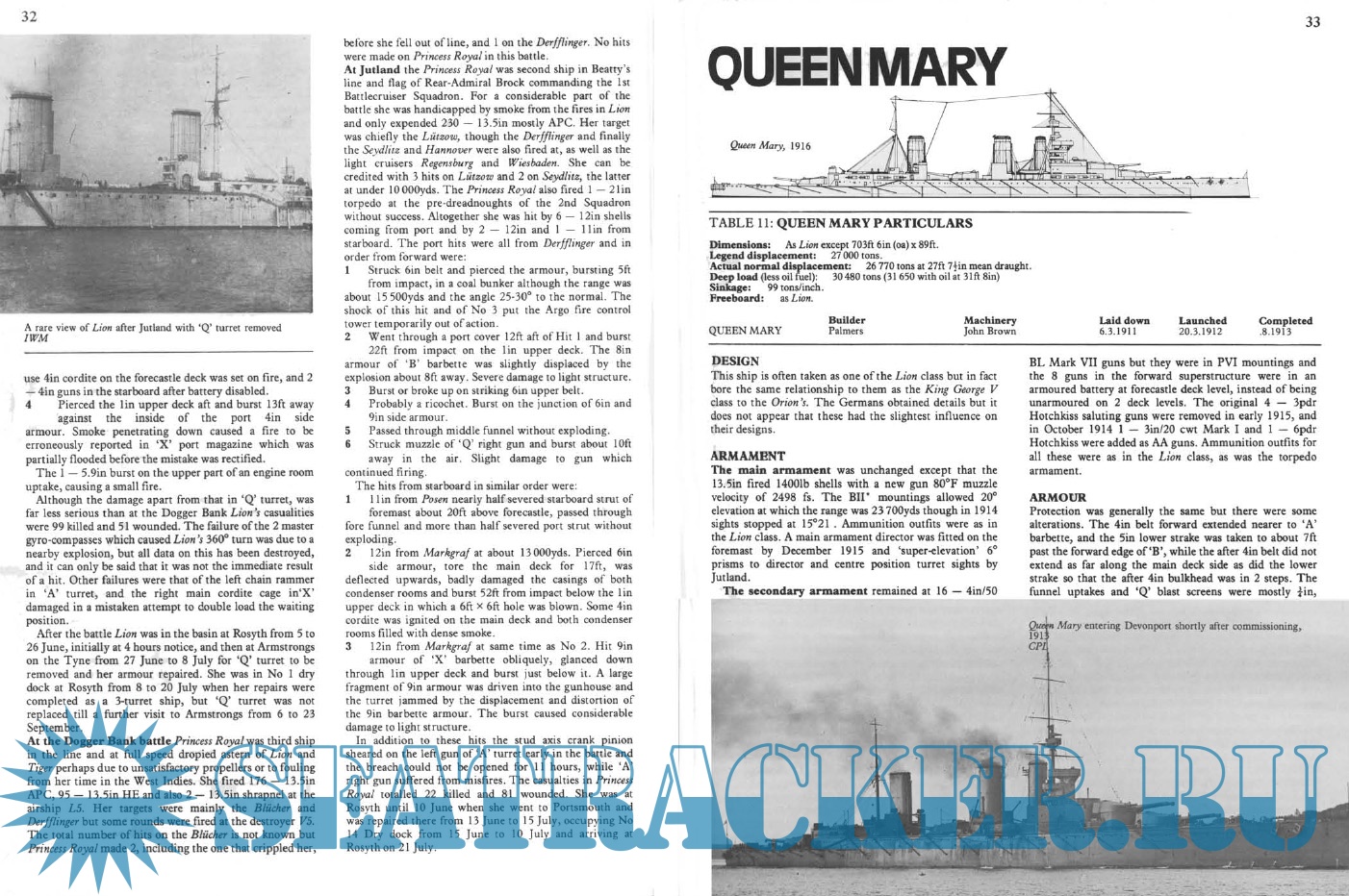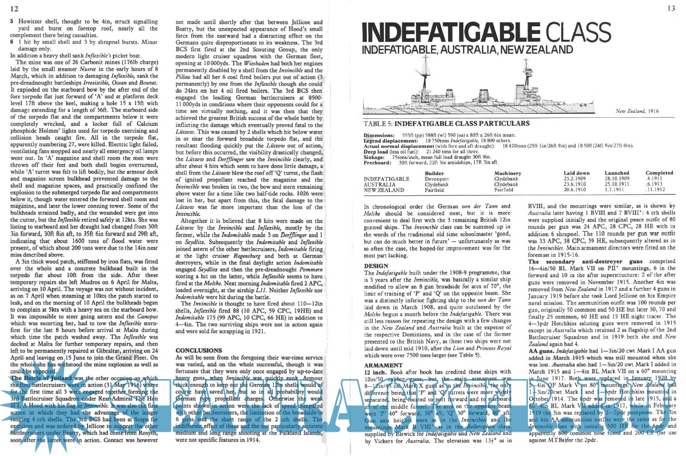 Description: This is a booklet on the British and German battlecruisers of the WW I era. The text describes the design development histories of the various classes of ships. The text is accompanied by numerous black and white photos and a few line drawings of the ship longitudinal profiles but no deck plans. There are short tabulations of dimensions and displacements; unfortunately, these tabulations do not include subjects such as armament, armor thicknesses, and machinery horsepower and speed. Those subjects are discussed in detail in the text. There is a subsection on “War Service” for each class in which the ship’s battle actions and damage incurred or sinking are described. The booklet also includes the last German battlecruiser classes of 1915 – 1918 which were designed, and in some cases started construction, but were never completed.