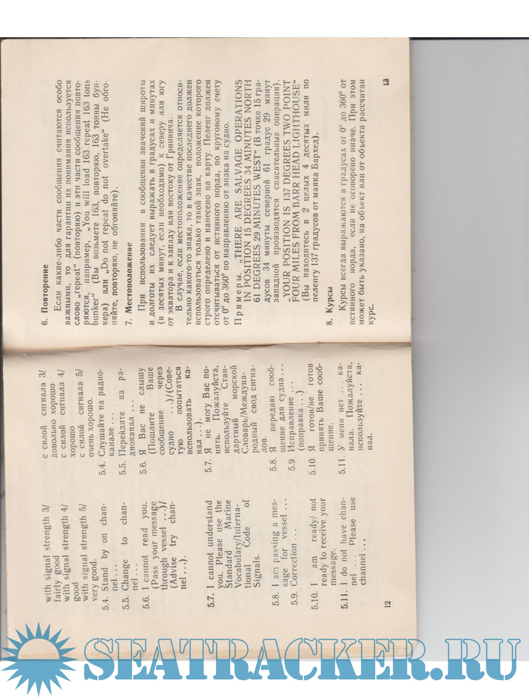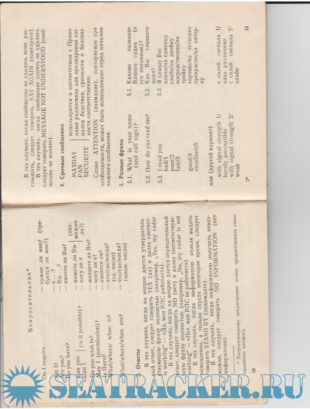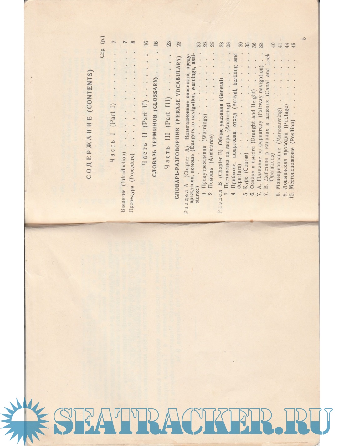 Год выпуска: 1977 Язык: Русский, Английский Автор: СССР Формат: PDF Качество: Отсканированные страницы Количество страниц: 38 Описание: Шикарный разговорник с большим количеством важного и основного набора фраз для общения и команд на мостике и на палубе