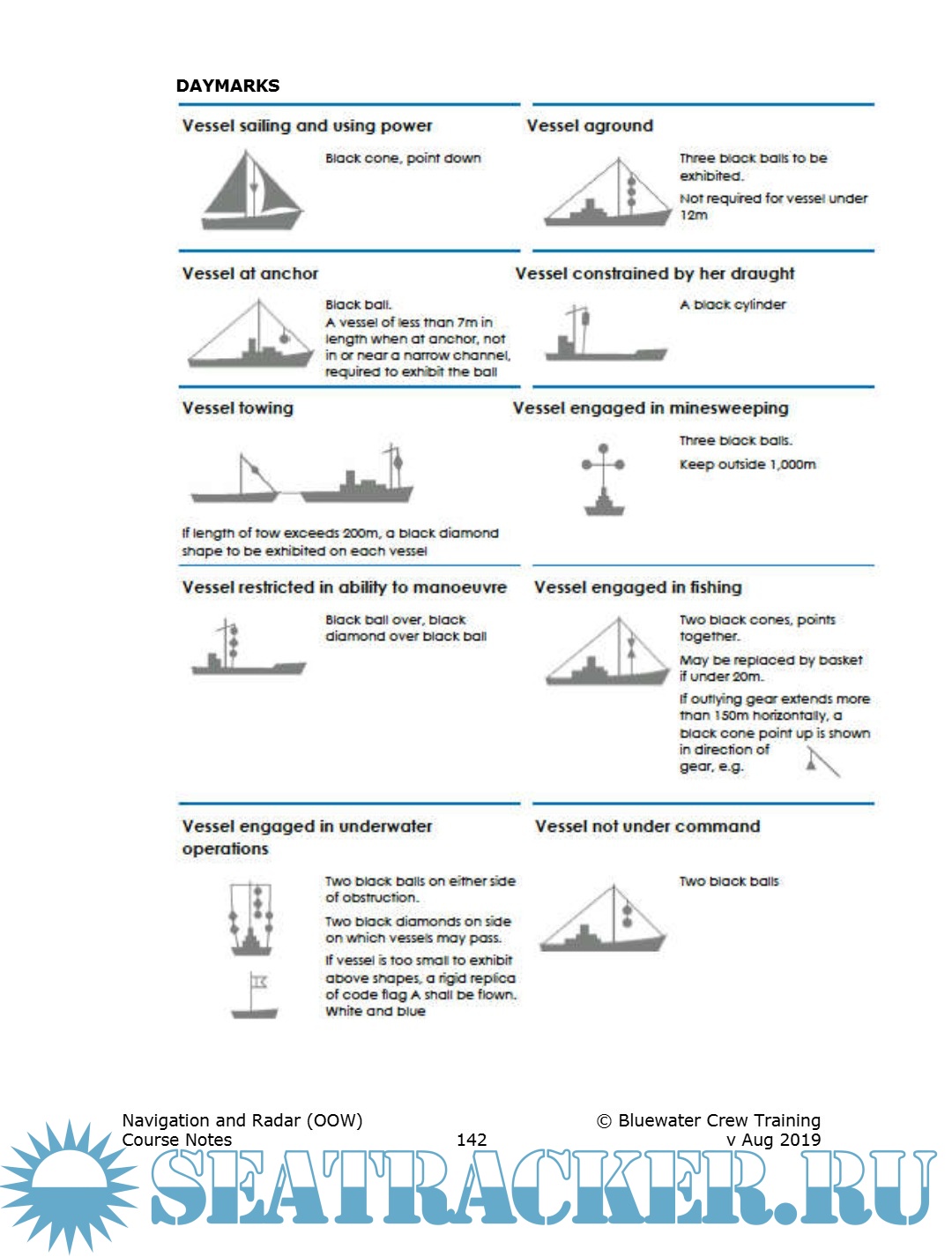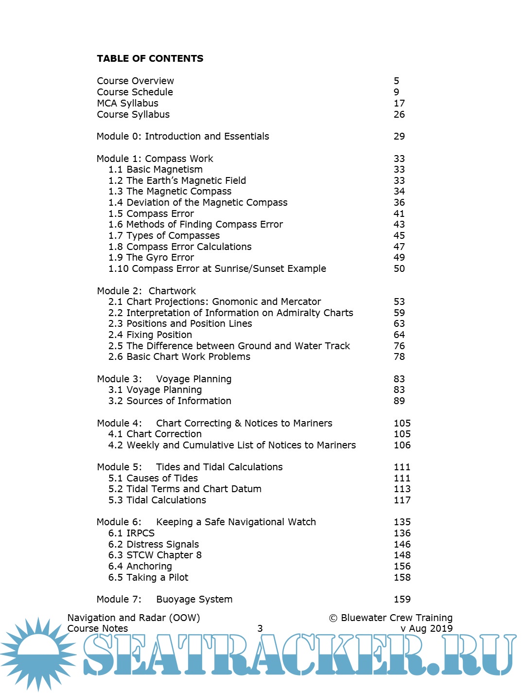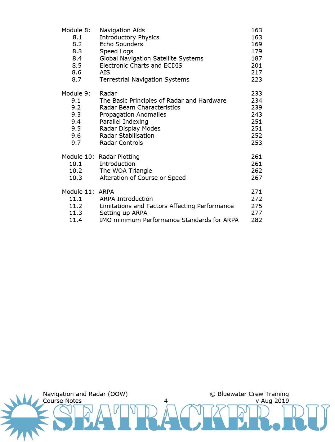 Year: 2019 Language: English Author: Bluewater Yachting Publisher: Bluewater Crew Training Format: PDF Quality: eBook Pages count: 286 Description: These notes form a part of a programme of study leading to command qualifications of large commercially and privately operated yachts, in accordance with the UK Maritime and Coastguard Agency (MCA) syllabus for Master (Yachts). This publication is a training aid - under no circumstances should it be used as legal advice or justification for any action. Readers must base any decisions for action upon current UK and International legislation and regulations. The publishers disclaim any liability for any loss or damage caused by any errors or omissions. This book is intended to assist those studying for the ten day Officer of the Watch, Navigation and Radar course and exam, a module in the Certificate of Competency for the Officer of the Watch of large commercial yachts issued under the Commercial Code for large yachts. The module will consist of sections on the Collision Regulations, Chart work, Buoyage, Electronic navigation aids, ECDIS, AIS, Radar and ARPA. The first 10 days will be theory leading to an IAMI written examination, and then 5 days each for a generic ECDIS course and a Bridge Watchkeeping course carried out on an approved simulator. The ECDIS and Watchkeeping courses need not be taken directly after the theory course. This module will be conducted over a minimum period of 20 days. This module requires assessment on an approved Radar Simulator and live electronic Navigational Equipment and includes navigational exercises in the use of radar and navigational aids on a simulated ship’s bridge. All participants MUST have successfully completed their Yachtmaster Course and have a good knowledge of the IRPCS, basic chartwork and navigational skills prior to taking this class. Bluewater Yachting (Antibes, France ; Ft. Lauderdale, FL). 2018