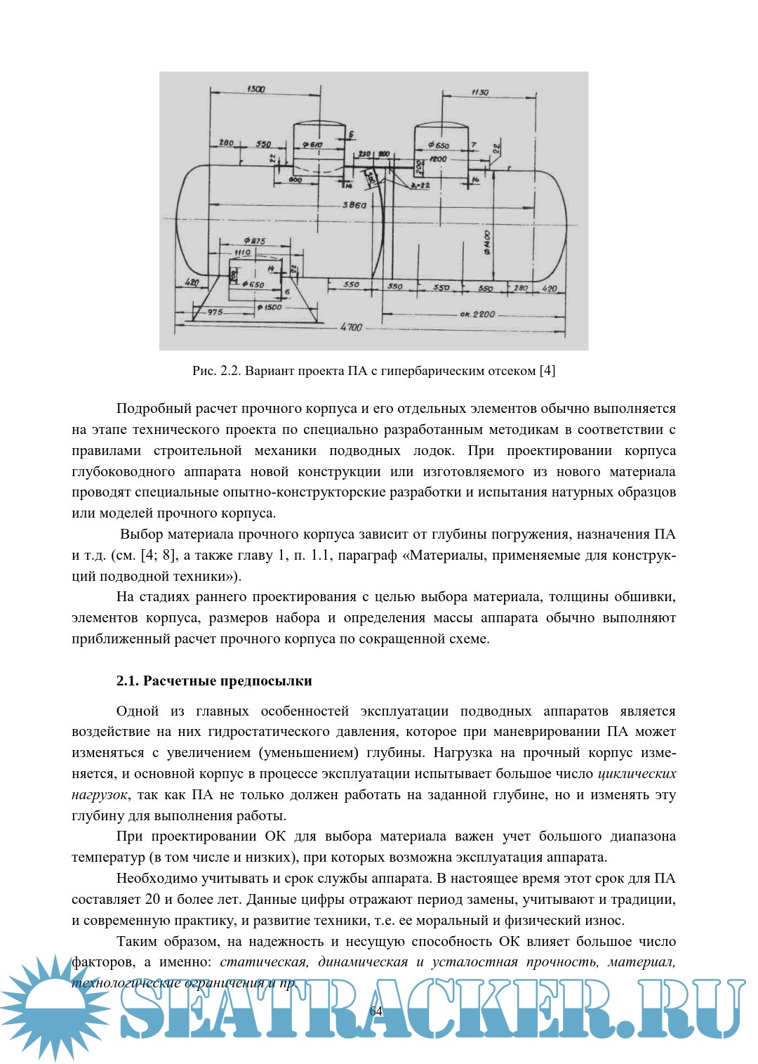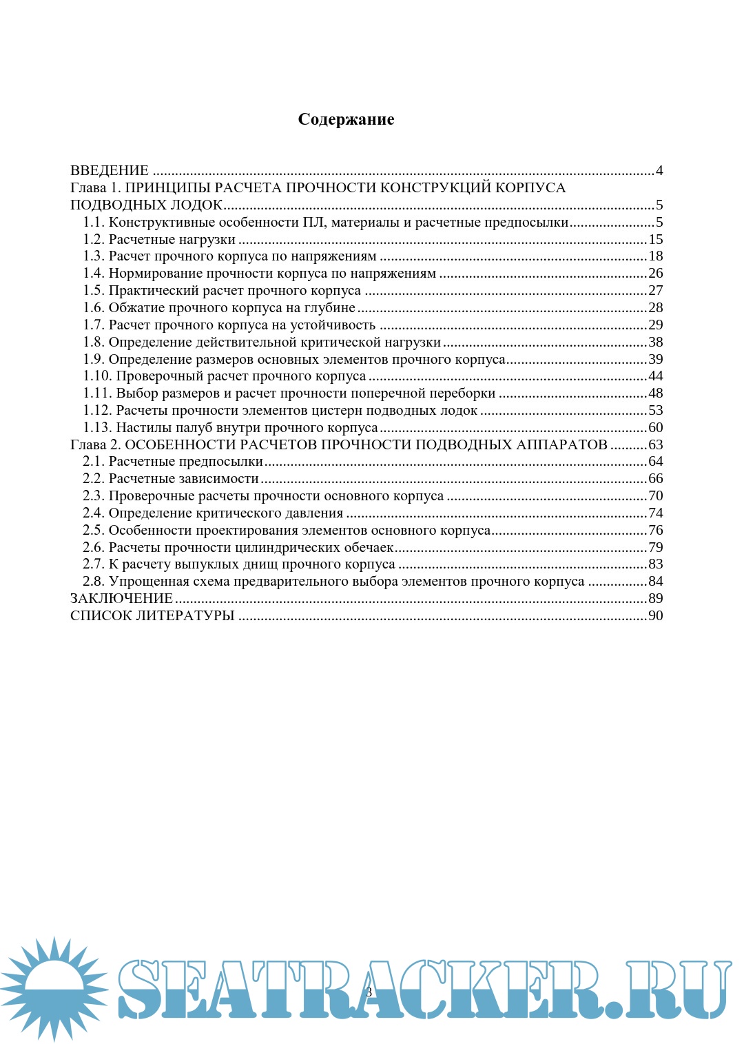 Введение. Принципы расчета прочности конструкций корпуса подводных лодок. Конструктивные особенности ПЛ, материалы и расчетные предпосылки. Расчетные нагрузки. Расчет прочного корпуса по напряжениям. Нормирование прочности корпуса по напряжениям. Практический расчет прочного корпуса. Обжатие прочного корпуса на глубине. Расчет прочного корпуса на устойчивость. Определение действительной критической нагрузки. Определение размеров основных элементов прочного корпуса. Проверочный расчет прочного корпуса. Выбор размеров и расчет прочности поперечной переборки. Расчеты прочности элементов цистерн подводных лодок. Настилы палуб внутри прочного корпуса. Особенности расчетов прочности подводных аппаратов. Расчетные предпосылки. Расчетные зависимости. Проверочные расчеты прочности основного корпуса. Определение критического давления. Особенности проектирования элементов основного корпуса. Расчеты прочности цилиндрических обечаек. К расчету выпуклых днищ прочного корпуса. Упрощенная схема предварительного выбора элементов прочного корпуса. Заключение. Список литературы.