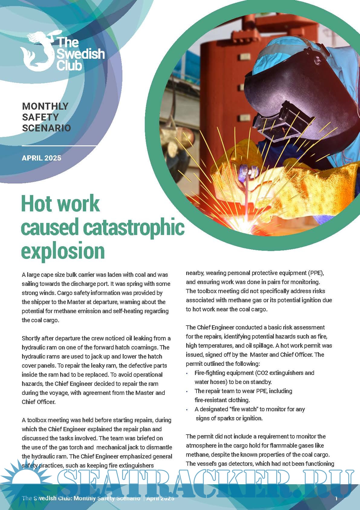 Year: 2025 Language: English Author: the Swedish Club Genre: Periodical publication Edition: February - April, 2025 Format: PDF Quality: eBook Pages count: 5 Description: The Club is publishing, on a monthly basis, a new Monthly Safety Scenario (MSS) to assist owners in their efforts of complying with the above regulations. Alternative scenarios will be uploaded in SCOL. It is easy to download the MSS and enter the written conclusions from the meeting and send feedback to the shore-based organisation. Issue February 2025 | Poor stability caused man overboard Issue March 2025 | Cargo shifted during North Atlantic crossing Issue April 2025 | Hot work caused catastrophic explosion Under the ISM requirement, owners are obliged to carry out monthly safety meetings or safety committee meetings onboard their vessels. This obligation stems from Chapter 5 of the ISM Code: “Master’s responsibility and authority” and furthermore from “5.1.2, motivating the crew in the observation of that policy.