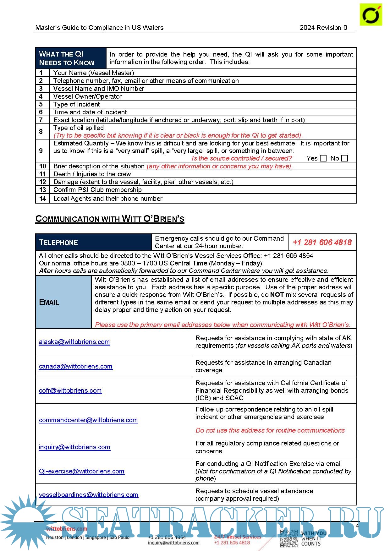 Year: 2024 Language: English Author: Witt O'Brien's Genre: Guide Edition: Rev.0 2024 Format: PDF Quality: eBook Pages count: Multiple Description: The Master of any vessel making a call to the United States, Canada or Panama (OOPS especially when transiting the Panama Canal) faces several regulatory issues that are specific to the country of call. Your vessel is enrolled with Witt O’Brien’s to ensure compliance with multiple regulations. These guides are intended to help the Master effectively and efficiently face these issues. Use of the directions in the guides will allow Witt O’Brien’s to better serve you. Information designed to save you time and effort is present in orange italics.