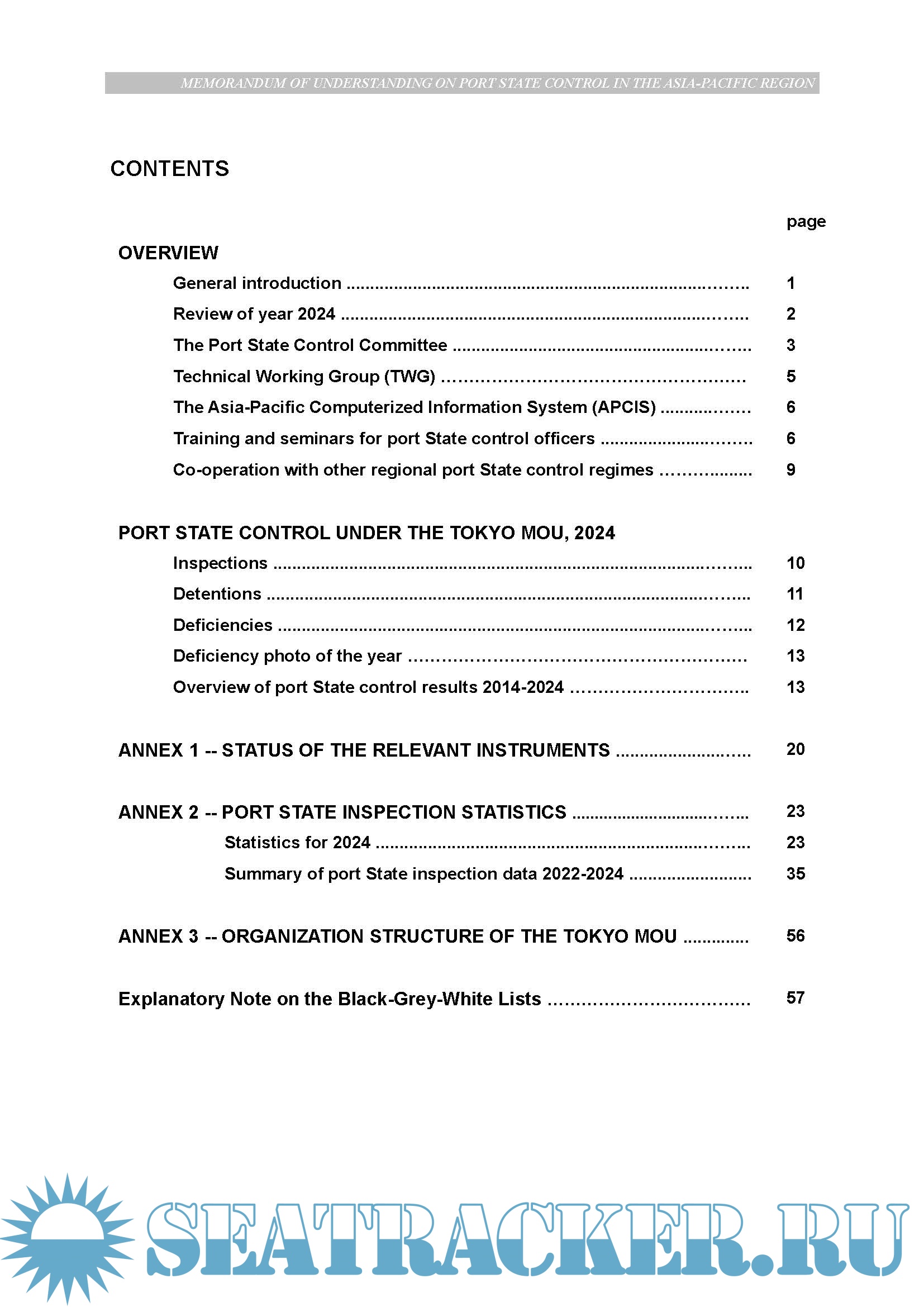 This Annual Report provides the overview of port State control activities and developments in the Tokyo MOU in 2024. The report also includes port State control statistics and analysis onthe results of inspections carried out by member Authorities during the year.