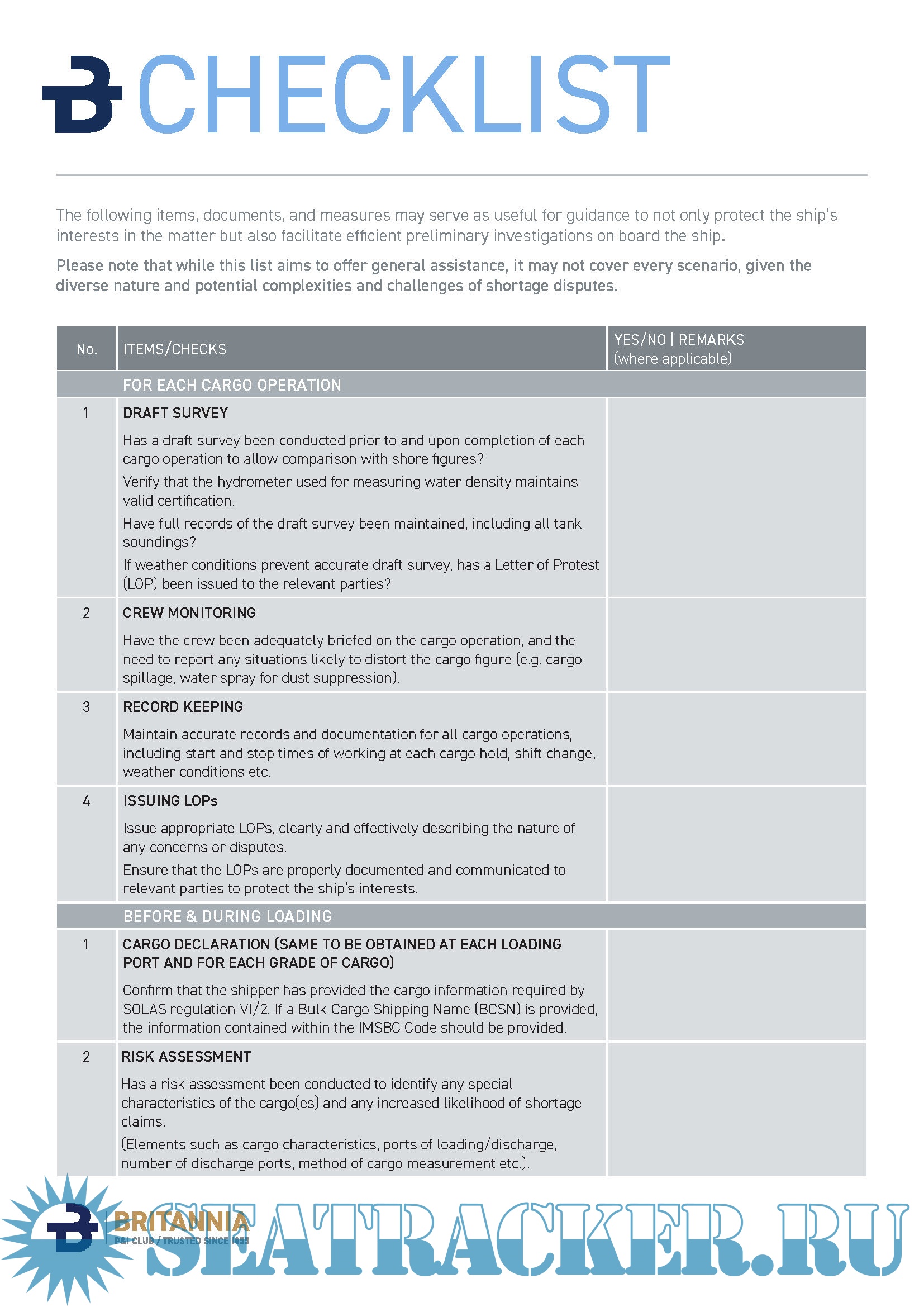 1. Preventing Bulk Cargo Shortage claims Guidance2. Dry Bulk Cargo Carriage Checklist