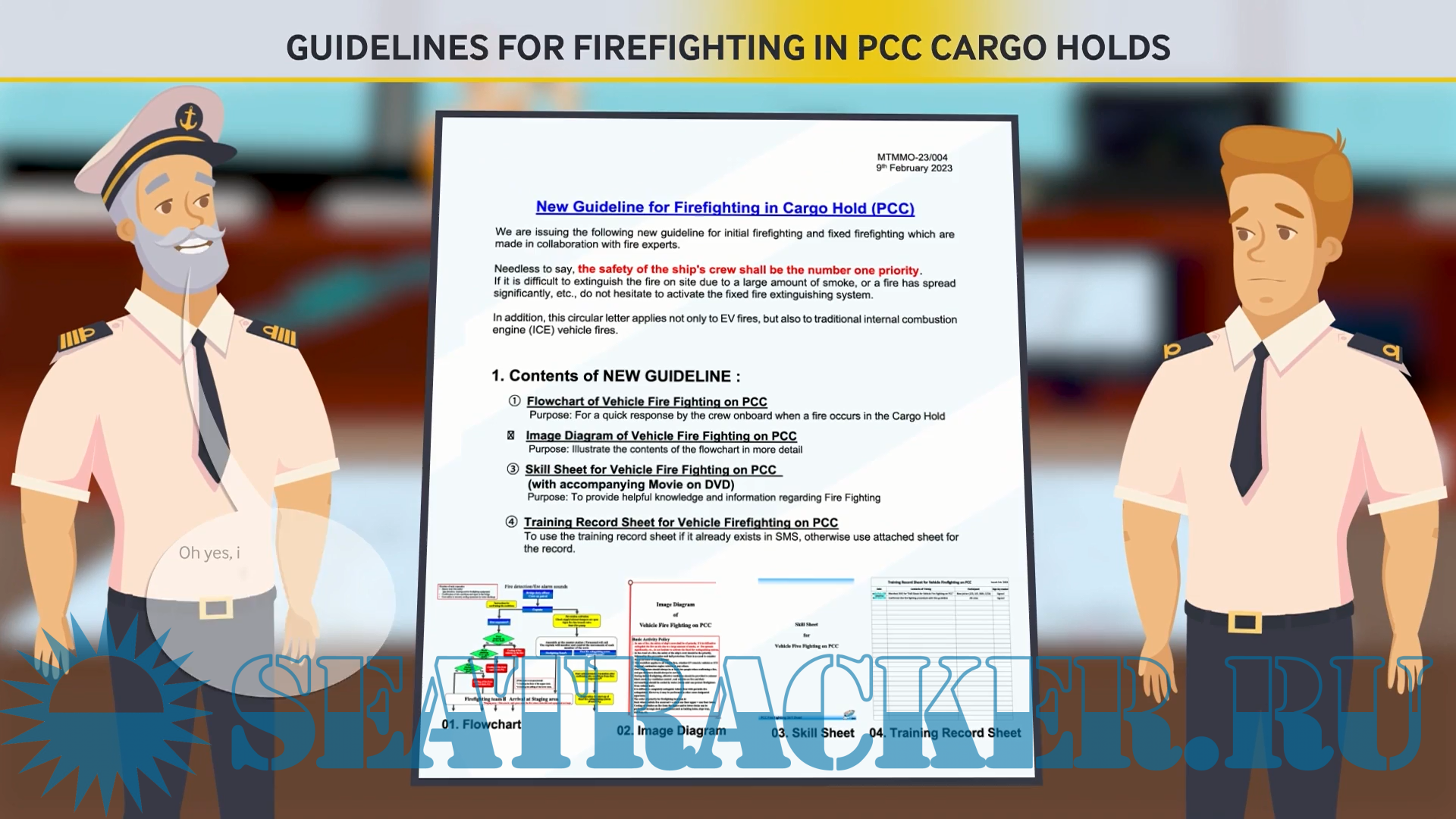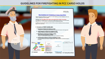 Description: The "PCC Firefighting Guidelines" video series provides comprehensive guidance on fire prevention measures, basic activity policy, and firefighting procedures in PCC cargo holds. The videos emphasize the importance of initial firefighting with water within the first 14 minutes of fire detection and the critical role of first responders in ensuring crew safety and minimizing fire spread. Part # 3.