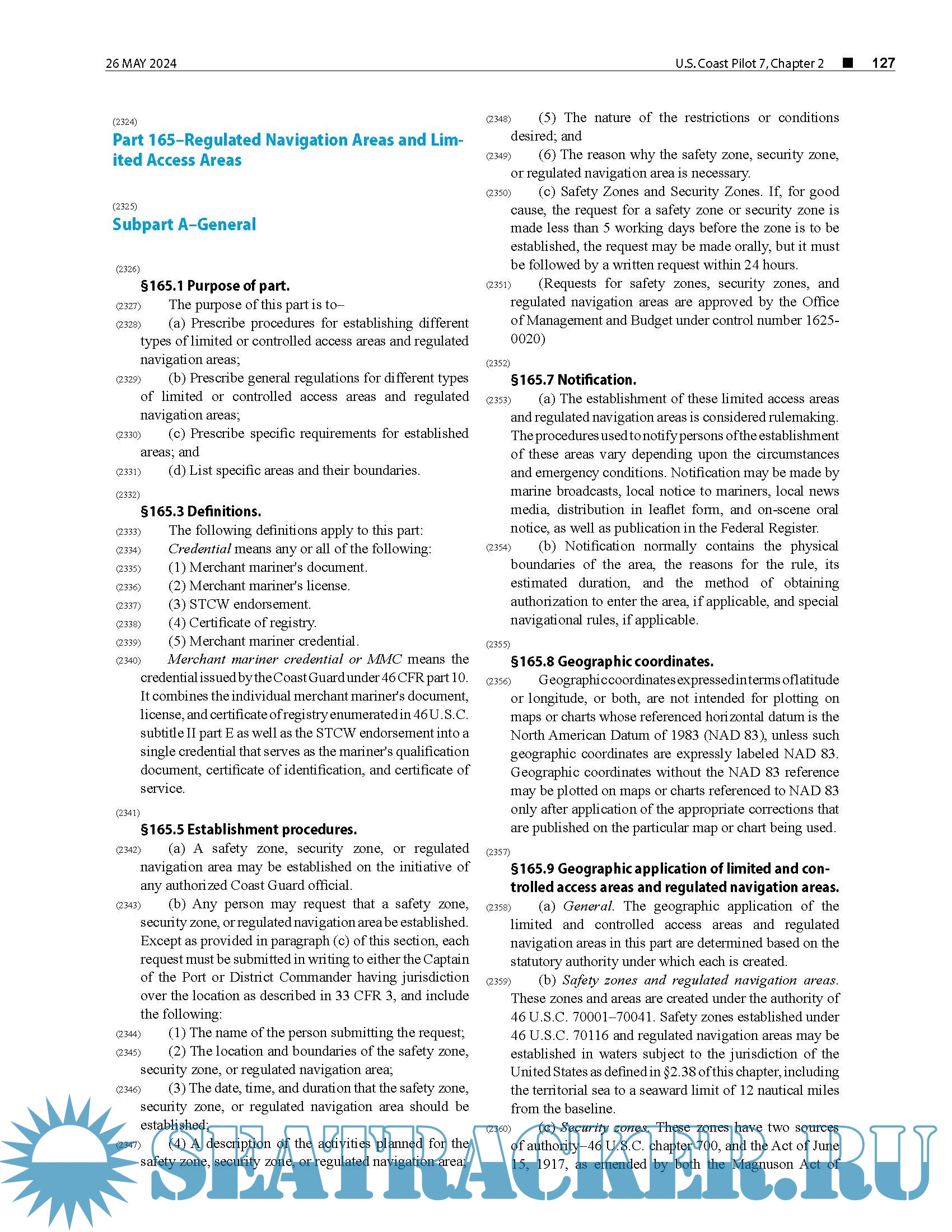 Topics in the Coast Pilot include channel descriptions, anchorages, bridge and cable clearances, currents, tide and water levels, prominent features, pilotage, towage, weather, ice conditions, wharf descriptions, dangers, routes, traffic separation schemes, small-craft facilities, and Federal regulations applicable to navigation.