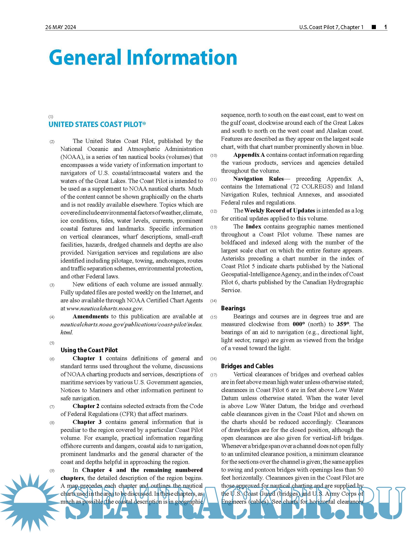 Year: 2024 Language: English Author: NOAA Genre: Documentation Edition: 2024 (56th) Edition Format: PDF Quality: eBook Pages count: 372 Description: The United States Coast Pilot® consists of a series of nautical books that cover a variety of information important to navigators of coastal and intracoastal waters and the Great Lakes. Issued in ten volumes, they contain supplemental information that is difficult to portray on a nautical chart. Topics in the Coast Pilot include channel descriptions, anchorages, bridge and cable clearances, currents, tide and water levels, prominent features, pilotage, towage, weather, ice conditions, wharf descriptions, dangers, routes, traffic separation schemes, small-craft facilities, and Federal regulations applicable to navigation. This edition cancels the 55th Edition and includes all previously published corrections. Updated upto 26 May 2023
