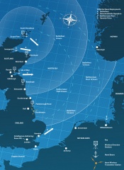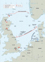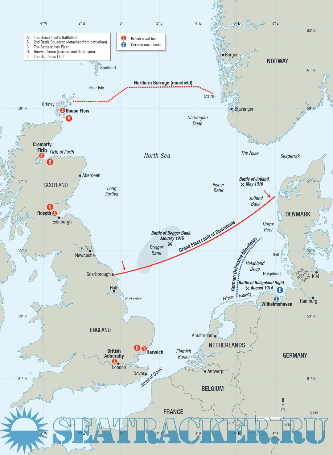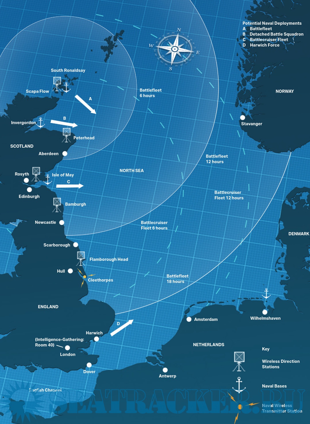 At the start of World War I, the Royal Navy's forces were amalgamated into a single entity, the Grand Fleet, and stationed in Scapa Flow, Orkney. The Grand Fleet was the largest amalgamation of modern naval power the world had seen, with over 30 dreadnought battleships or battlecruisers, and a plethora of cruisers and destroyers. In 1917 it was reinforced further by a powerful American squadron.