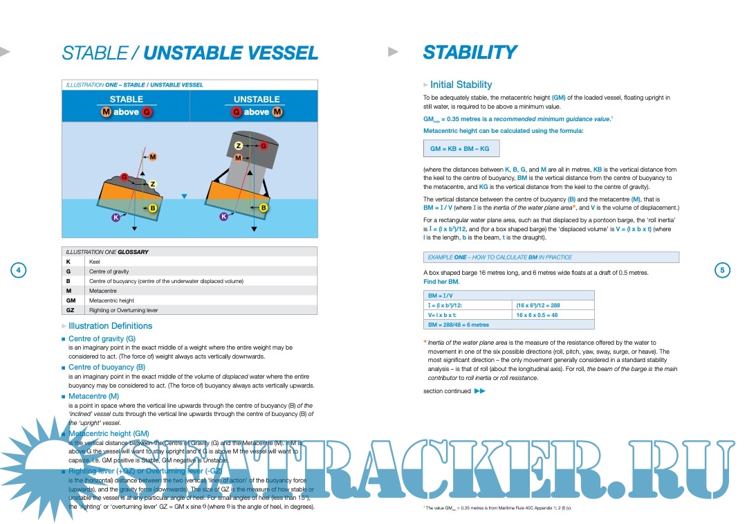 Year: 2006 Language: English Author: Maritime New Zealand Genre: Guide ISBN: 0-478-18839-0 Format: PDF Quality: eBook Pages count: 10 Description: The purpose of these Guidelines is to provide insight into the basic stability concepts relevant to loading and to loaded pontoon barges. Pontoon barges are used for a wide variety of cargoes from bulk loads such as coal, rock, and logs – with low to medium centres of gravity – through to vehicles, and unique ‘one-off’ loads such as industrial equipment and storage tanks, which can have very high centres of gravity, and windage areas. Pontoon barges are also used as work platforms for many types of equipment including cranes and pile drivers. Stability considerations are critical when conducting transportation and other marine operations safely. The guidance that follows only deals with stability. It is assumed that other aspects of best marine practice – such as having sufficient handling power (bollard pull), and manoeuvring capability, watertightness arrangements (including securing of hatches etc), and ensuring adequacy of tow rigging, emergency, and safety gear – have also all been addressed.