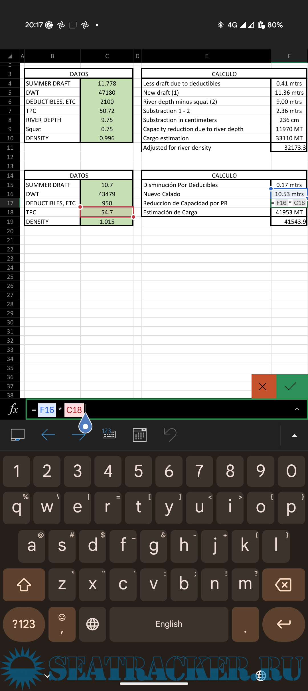 Hi I corrected your second for sea anchorage where in Reducción de Capacidad por PR should be 950 and reflected as per TPC Refer to screenshots All is good for fast calculations but having hydrostatic table is better. If you are working on general or bulk carriers then see my post on Draft survey and trimming program. That might help you if i have your vessel in my database.