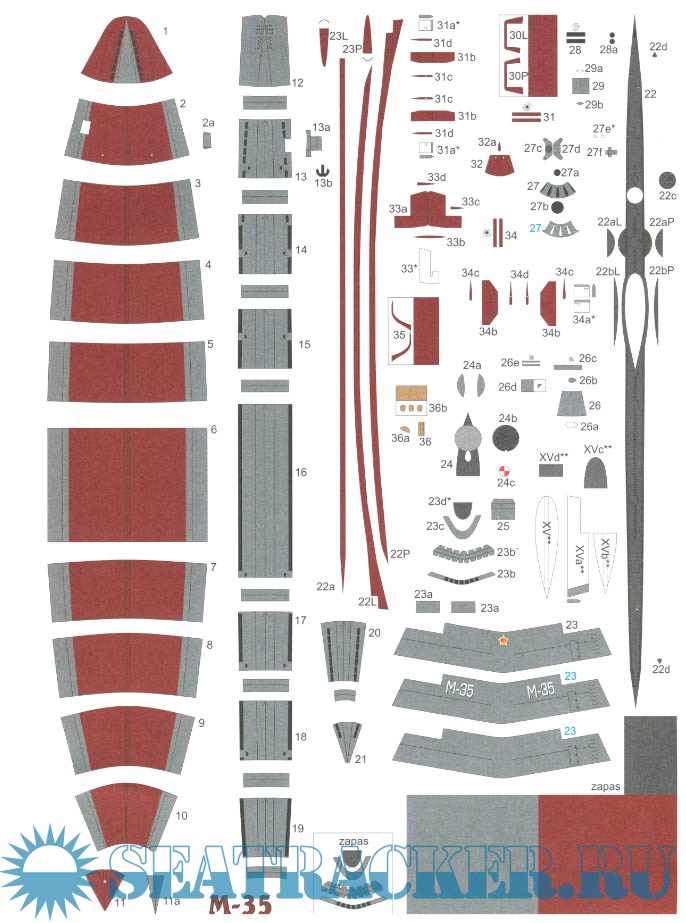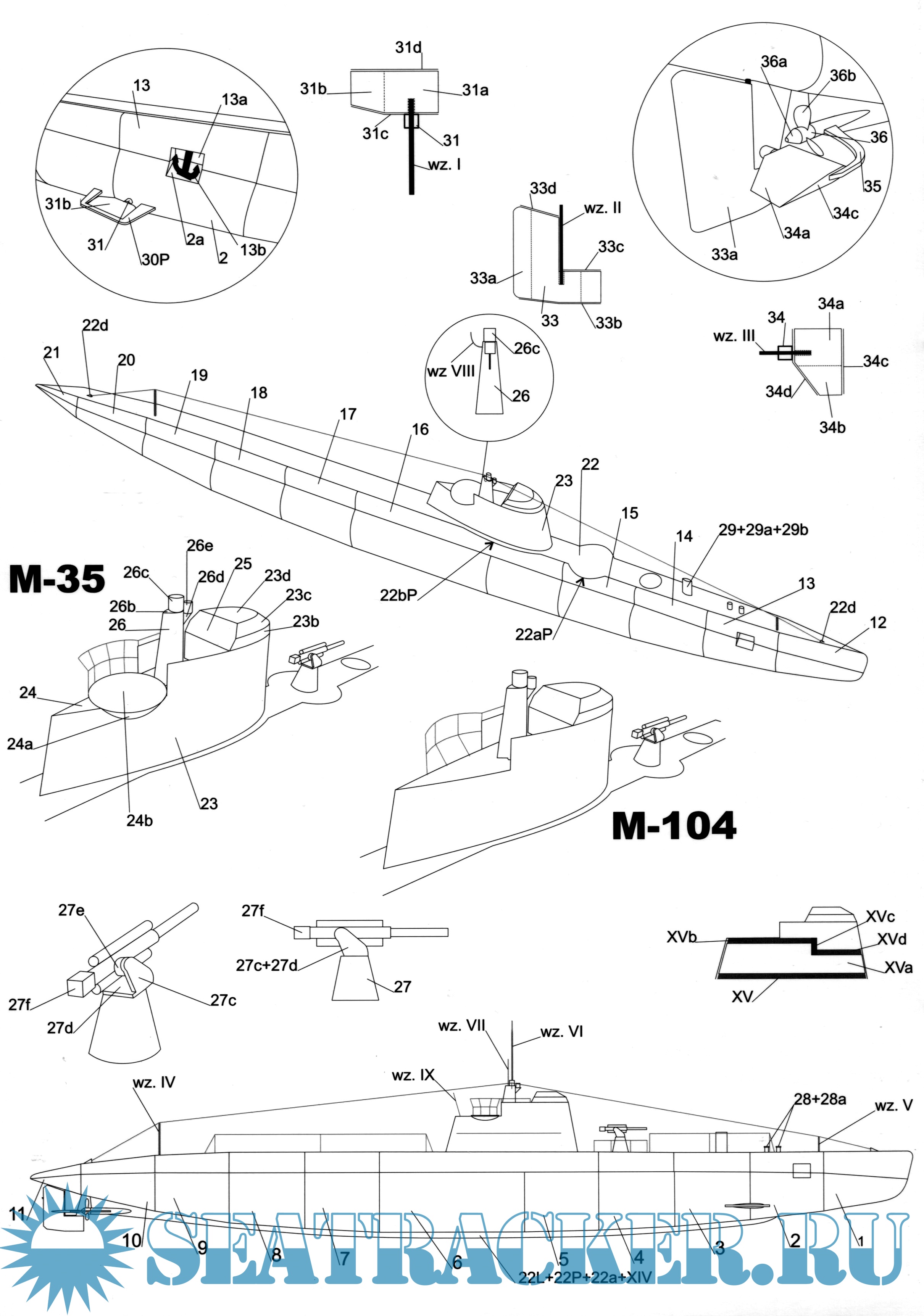 8 листов цветных выкроек и инструкций для изготовления бумажной модели подводной лодки типа М (М-35 или М-104) в масштабе 1:200Скриншоты