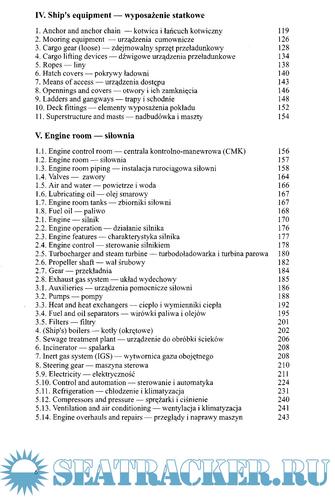 Ponad kilkaset rysunków z dwujęzycznym opisem, obejmujące zagadnienia techniczne i codzienne słownictwo morskie.