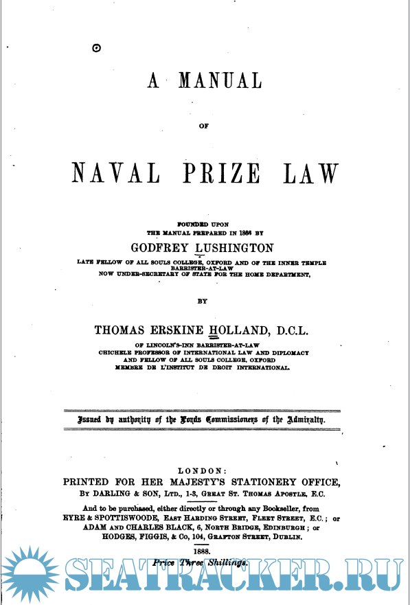 Year: 1888 Language: English Author: Thomas Erskine Holland Format: PDF Quality: Scanned pages Pages count: 181 Description: A Manual of Naval Prize Law (1888)