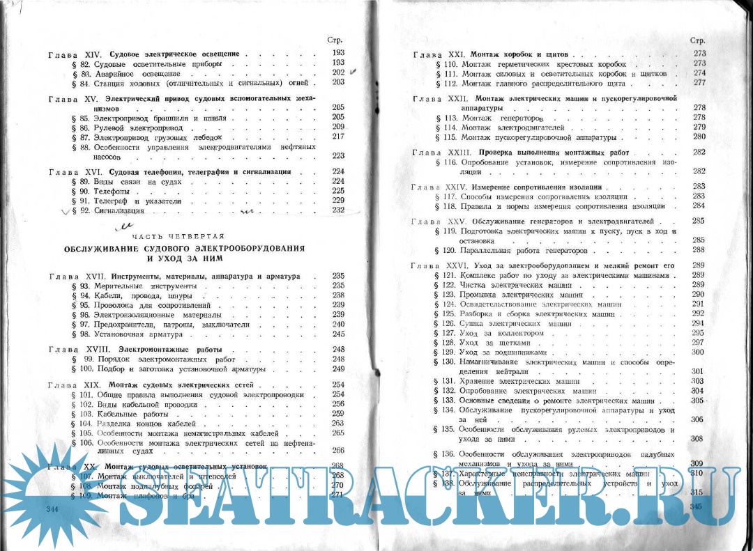 Третья часть посвящена электрическому оборудованию судов: генераторам, распределительным системам, кабельным сетям, заземлению, защитам, эксплуатации в морских условиях. В заключительной, четвёртой части, представлены практические указания, технологические процессы монтажа, ремонта и обслуживания электрического оборудования на судах, вопросы безопасности и особенностей морской эксплуатации. Книга снабжена схемами, чертежами и рисунками черно-белого исполнения, что делает её удобным справочным пособием как для учащихся морских училищ, так и для действующих специалистов.