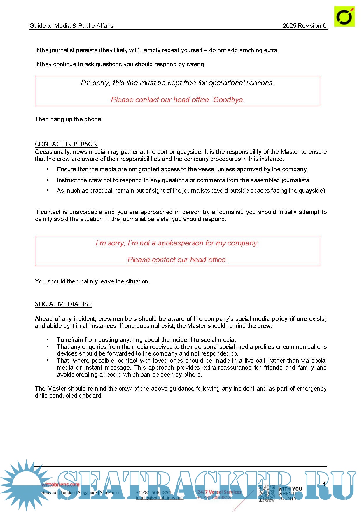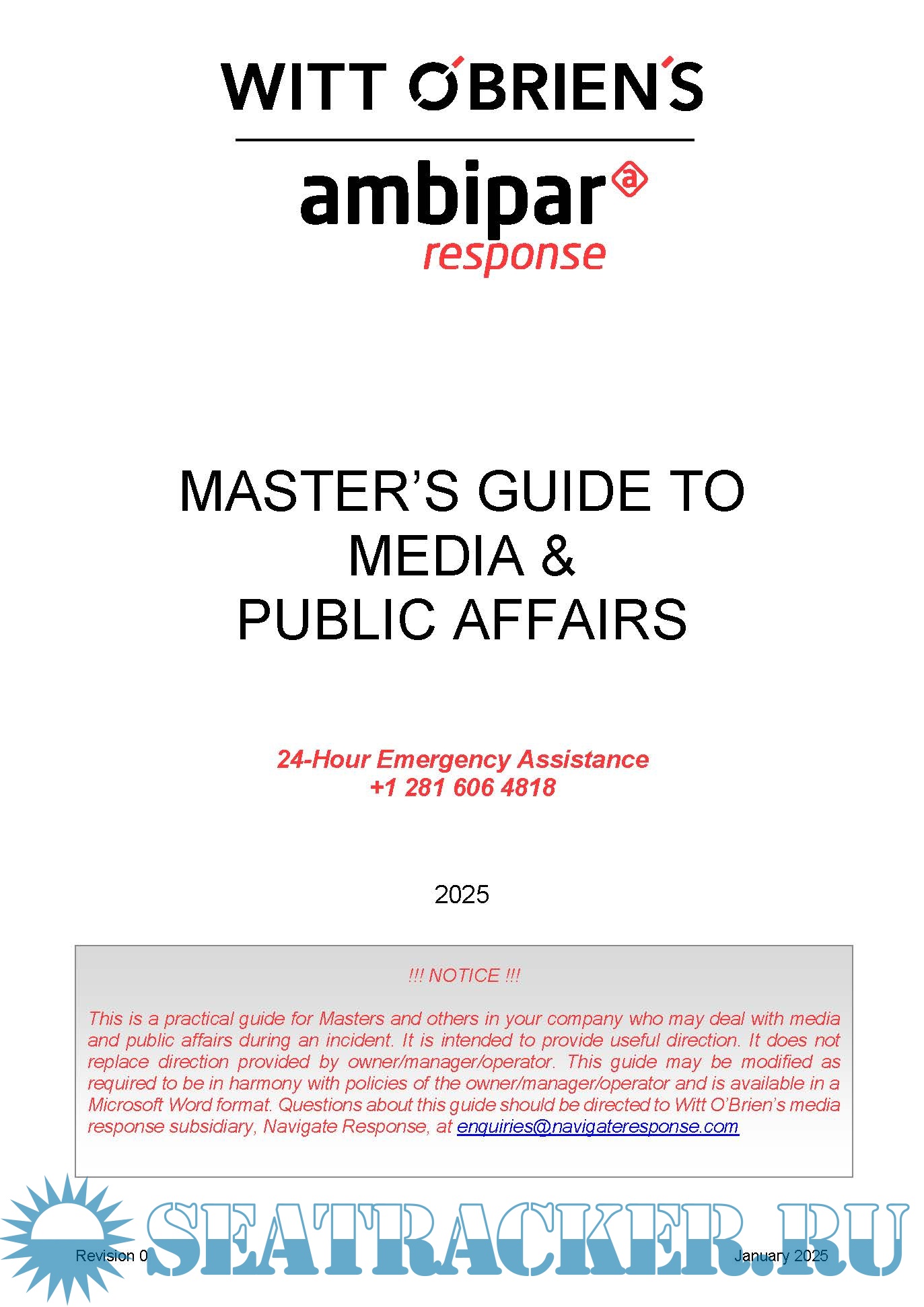 Year: 2025 Language: English Author: Witt O’Brien’s Genre: Guide Publisher: Witt O’Brien’s Edition: Revision 0, 2025 Format: PDF Quality: eBook Pages count: 7 Description: During any incident the Master is responsible for the safety of the crew and vessel. As the Master you will also face other pressures. You are one of the company’s representatives on the scene and so third parties, including journalists, may want to speak to you and your crew to gather information about the ongoing situation. This guide will help you to understand your role in responding to media and other enquiries during an incident. It outlines the support that is available to you to ensure that you can continue to focus on your primary duties. This is a practical guide for Masters and others in your company who may deal with media and public affairs during an incident. It is intended to provide useful direction. It does not replace direction provided by owner/manager/operator. This guide may be modified as required to be in harmony with policies of the owner/manager/operator and is available in a Microsoft Word format. Questions about this guide should be directed to Witt O’Brien’s media response subsidiary, Navigate Response