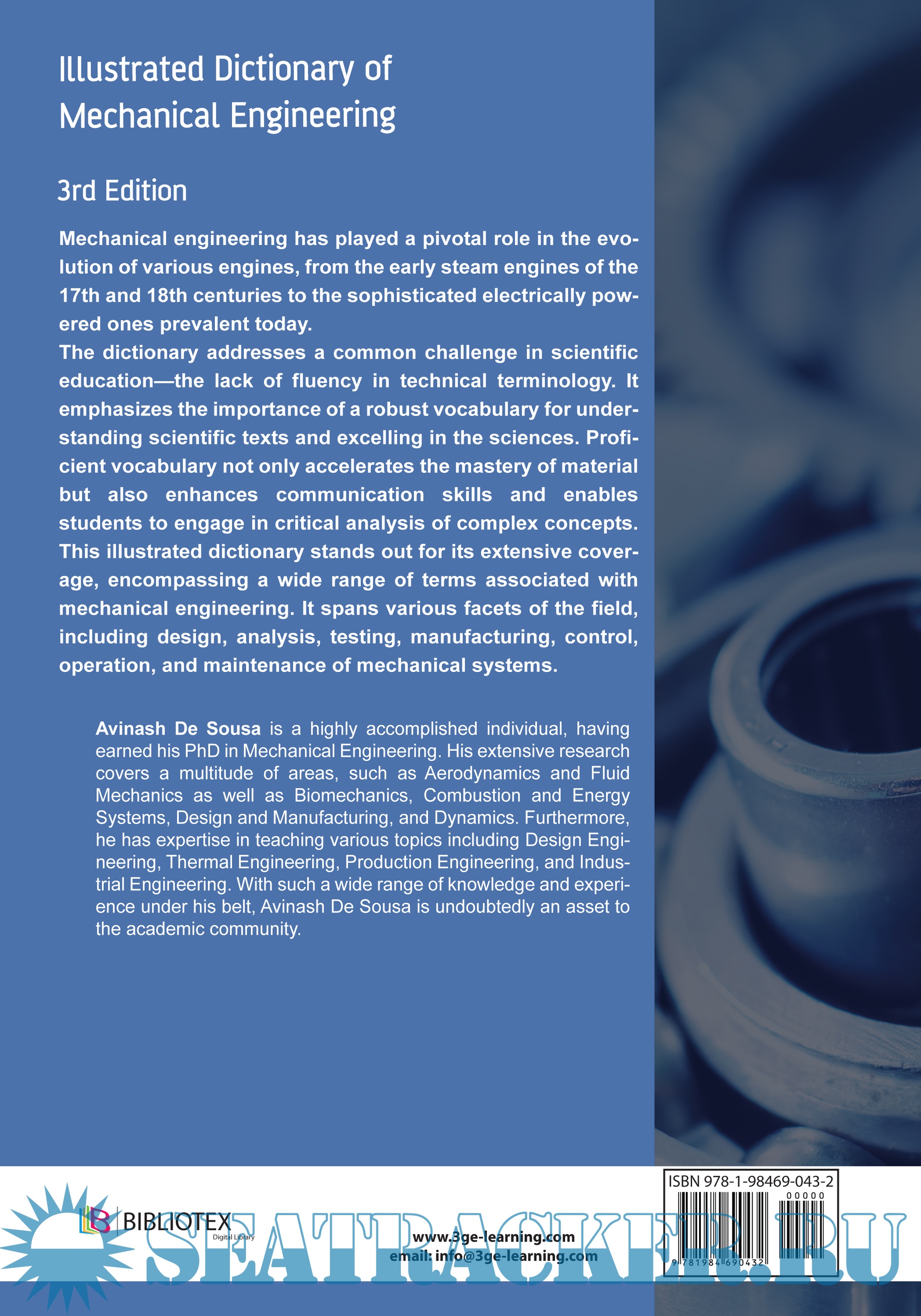 The 3rd edition of Illustrated Dictionary of Mechanical Engineering is updated with new terms and revised comprehensively. These descriptive illustrations provide a concise and thorough understanding of the subject. The dictionary provides state-of-the-art scientific and practical terms, presented in an easy-to-use, A-Z order with pictures and figures as well as examples are given to clarify the terms.