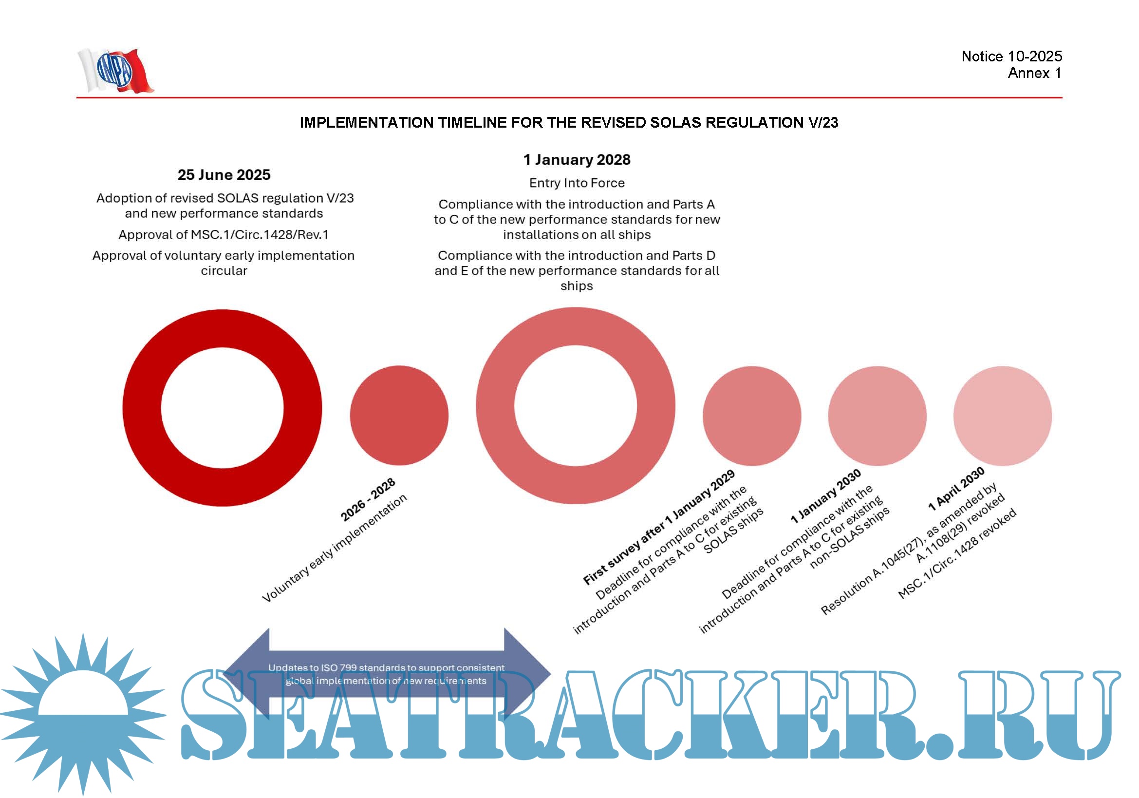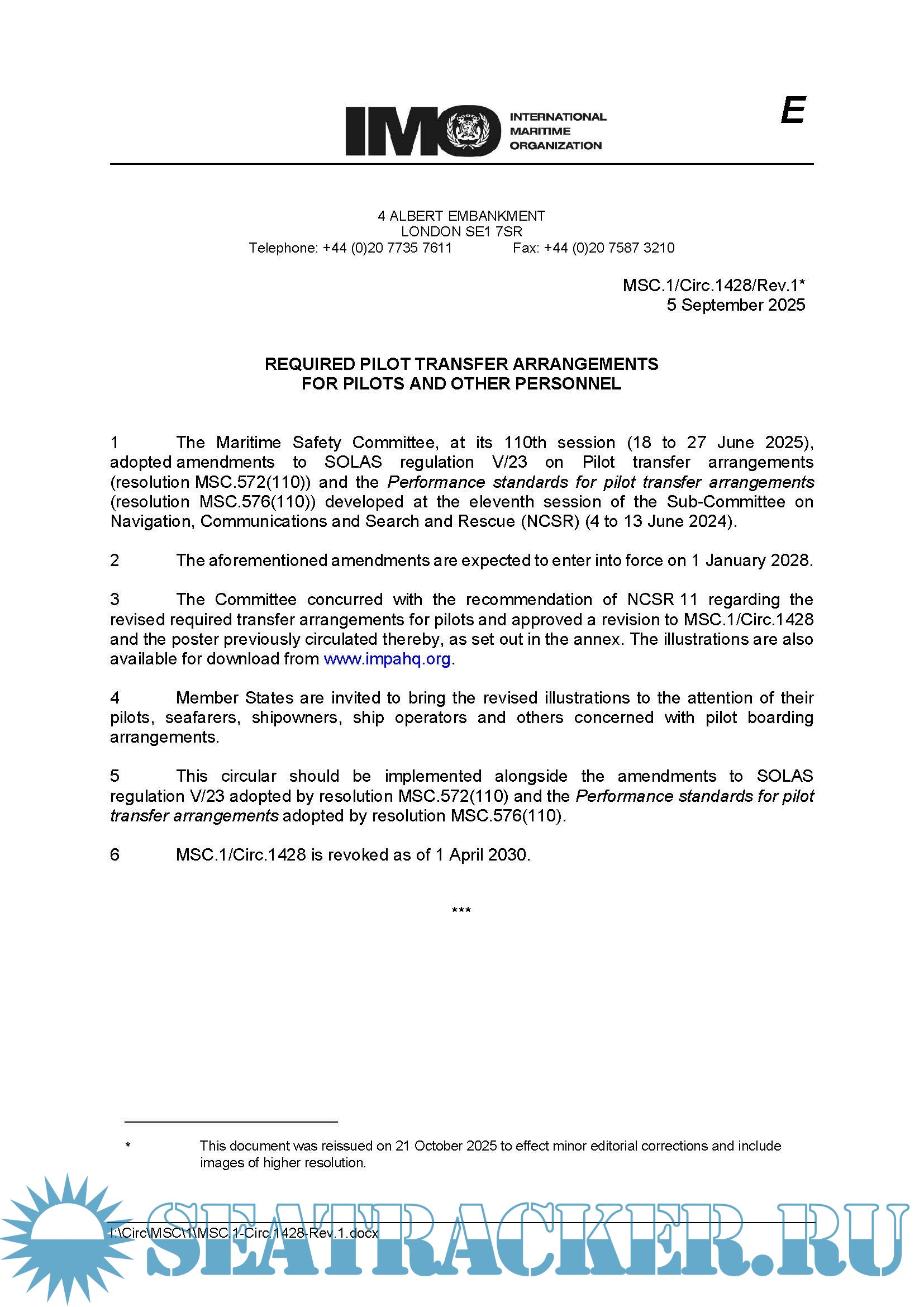 Year: 2025 Language: English Author: IMO, IMPA Genre: Regulatory document, Normative documents Publisher: IMPA, UKMPA Edition: September 2025 Format: PDF Quality: eBook Pages count: Multiple Description: SOLAS Requirements and Implementation of the Amendments to SOLAS Regulation V/23, Enhancing the Safety of Pilot Transfer Arrangements and Required Pilot Transfer Arrangements. Marine pilots routinely face high-risk transfers between moving ships and small boats, often in challenging conditions. A single failure in equipment or procedure can result in severe injury or loss of life. To address these issues, the IMO’s Maritime Safety Committee during its 110th session (MSC 110) adopted amendments to SOLAS Regulation V/23 and the associated new Performance Standards for pilot transfer arrangements, which contains detailed requirements for design, manufacture, construction, inspection, stowage, maintenance, replacement, and familiarisation. The amendments, which will enter into force on 1 January 2028, forbid the use of mechanical pilot hoists and require adequate lighting for all pilot transfer areas and deck embarkation points. The IMO has issued a circular encouraging voluntary early implementation ahead of the specified dates. Additional info: Included Required Pilot Transfer Arrangements Poster - for HIGH Resolution printing, in accordance with SOLAS Chapter V Regulation 23 (2025). In accordance with IMO requirements and IMPA recommendations, this poster explains how to safely rig pilot boarding and transfer arrangements. It illustrates the different arrangements required according to the height of the access point above the waterline. It also sets out the duties of the responsible officer during pilot boarding and disembarkation. The poster reflects the requirements detailed in SOLAS Ch V, Reg 23 and the approved IMO circular MSC.1/Circ.1428/Rev.1. The updated requirements were adopted by the IMO at its 110th MSC session on 25 June 2025 under IMO resolution MSC.576 (110). While the updated requirements do not enter into force until 1 January 2028, the voluntary early implementation of the updated amendments to SOLAS Ch V, Reg 23 and the use of this updated pilot boarding arrangements poster are strongly recommended under MSC.1/Circ.1690.