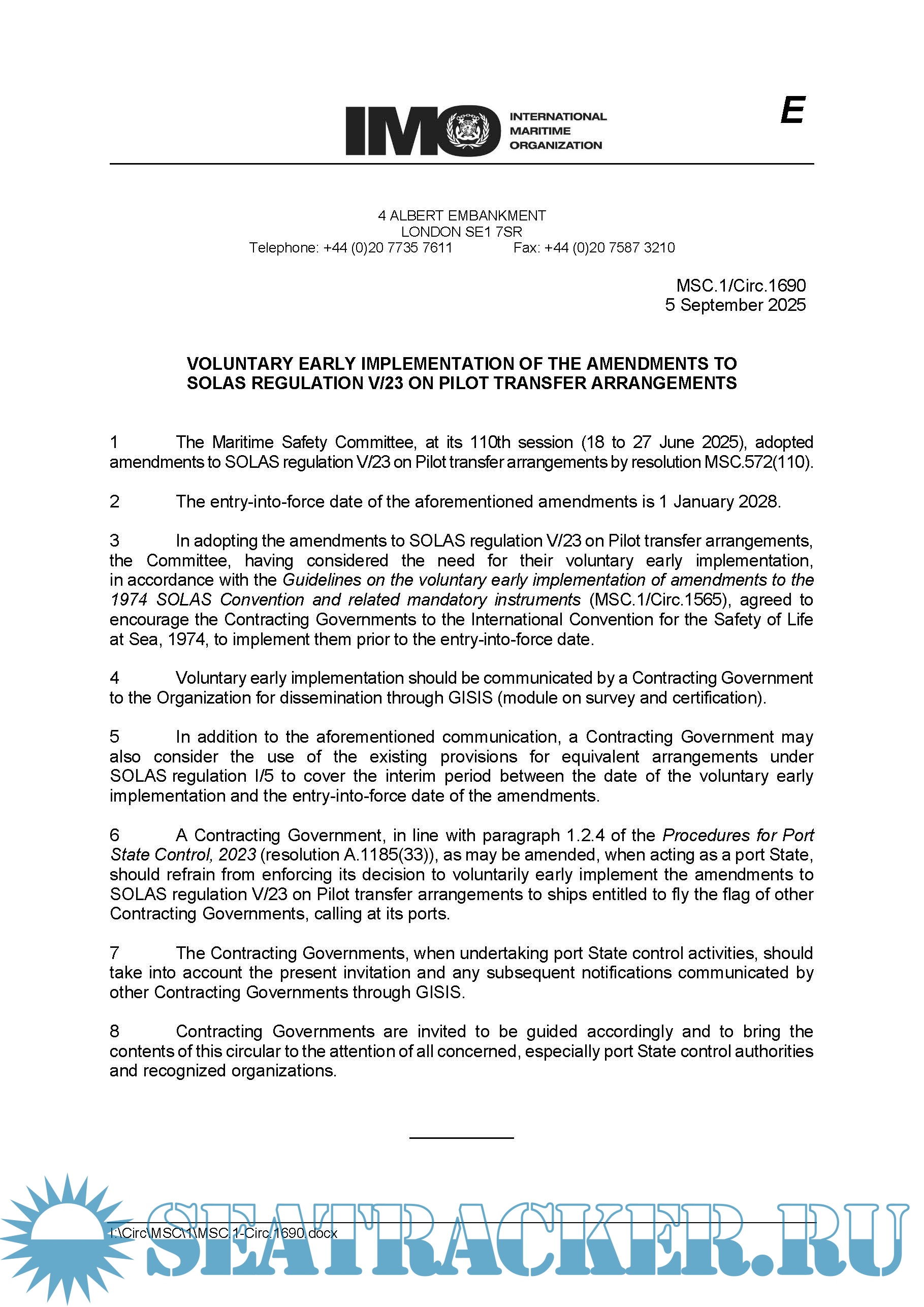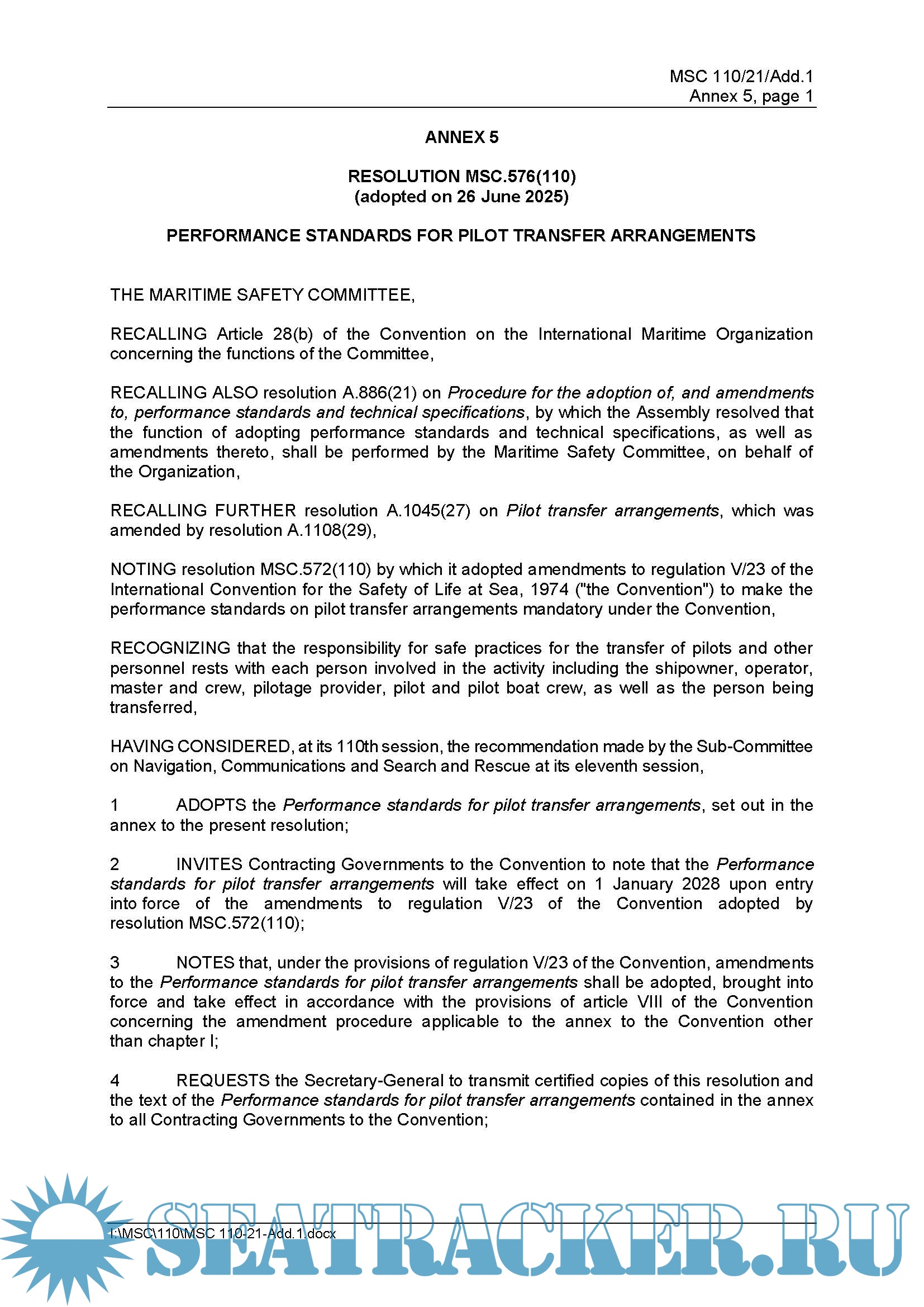 Description: SOLAS Requirements and Implementation of the Amendments to SOLAS Regulation V/23, Enhancing the Safety of Pilot Transfer Arrangements and Required Pilot Transfer Arrangements.