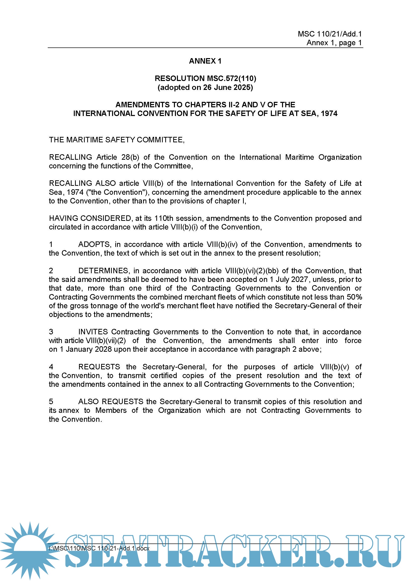 SOLAS Requirements and Implementation of the Amendments to SOLAS Regulation V/23
