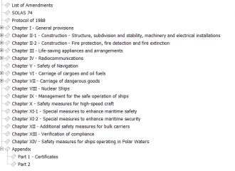List of Amendments SOLAS 74 Protocol of 1988 Chapter I General provisions Chapter II-1 Construction – Structure, subdivision and stability, machinery and electrical installations Chapter II-2 Construction – Fire protection, fire detection and fire extinction Chapter III Life-saving appliances and arrangements Chapter IV Radiocommunications Chapter V Safety of navigation Chapter VI Carriage of cargoes and oil fuels Chapter VII Carriage of dangerous goods Chapter VIII Nuclear ships Chapter IX Management for the safe operation of ships Chapter X Safety measures for high-speed craft Chapter XI-1 Special measures to enhance maritime safety Chapter XI-2 Special measures to enhance maritime security Chapter XII Additional safety measures for bulk carriers Appendix Certificates Part 1 - Certificates Part 2