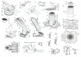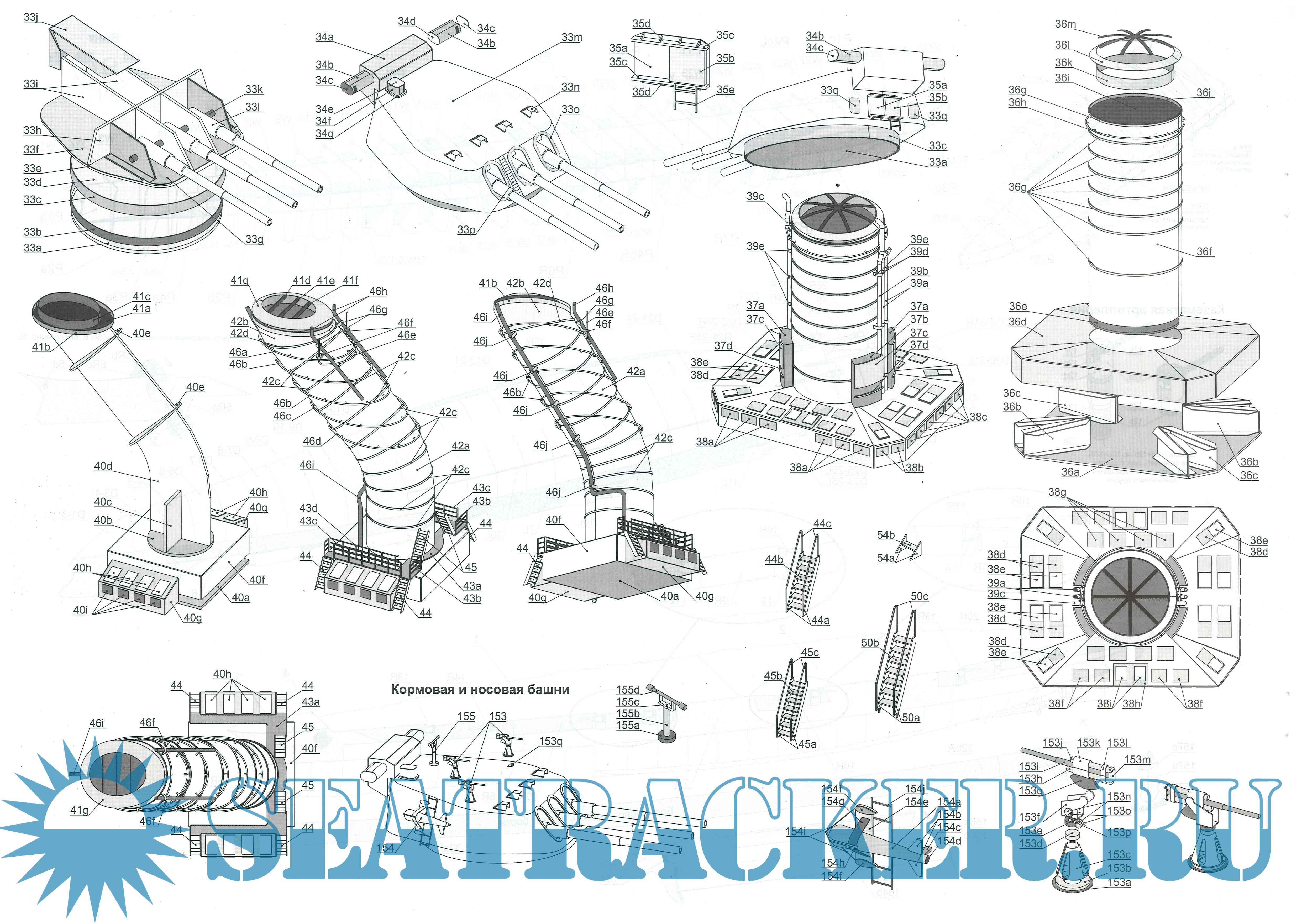 Описание: 40 листов цветных выкроек и описаний для изготовления бумажной модели линкора "Парижская коммуна" по состоянию на 1937 год в масштабе 1:200
