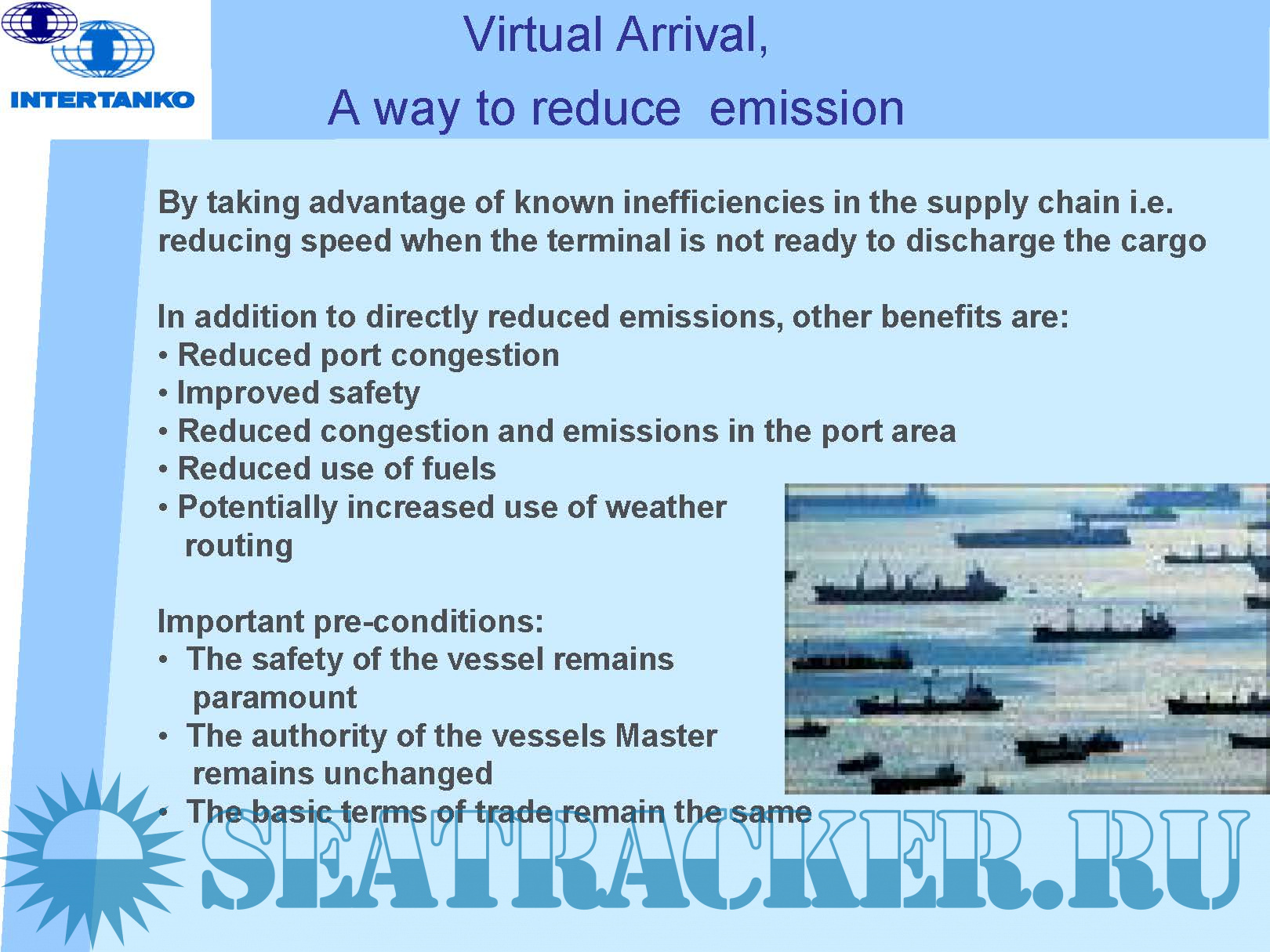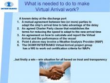 •The Virtual Arrival concept takes advantage of inefficiency within the transport chain through an agreed and managed reduction of a vessels passage speed