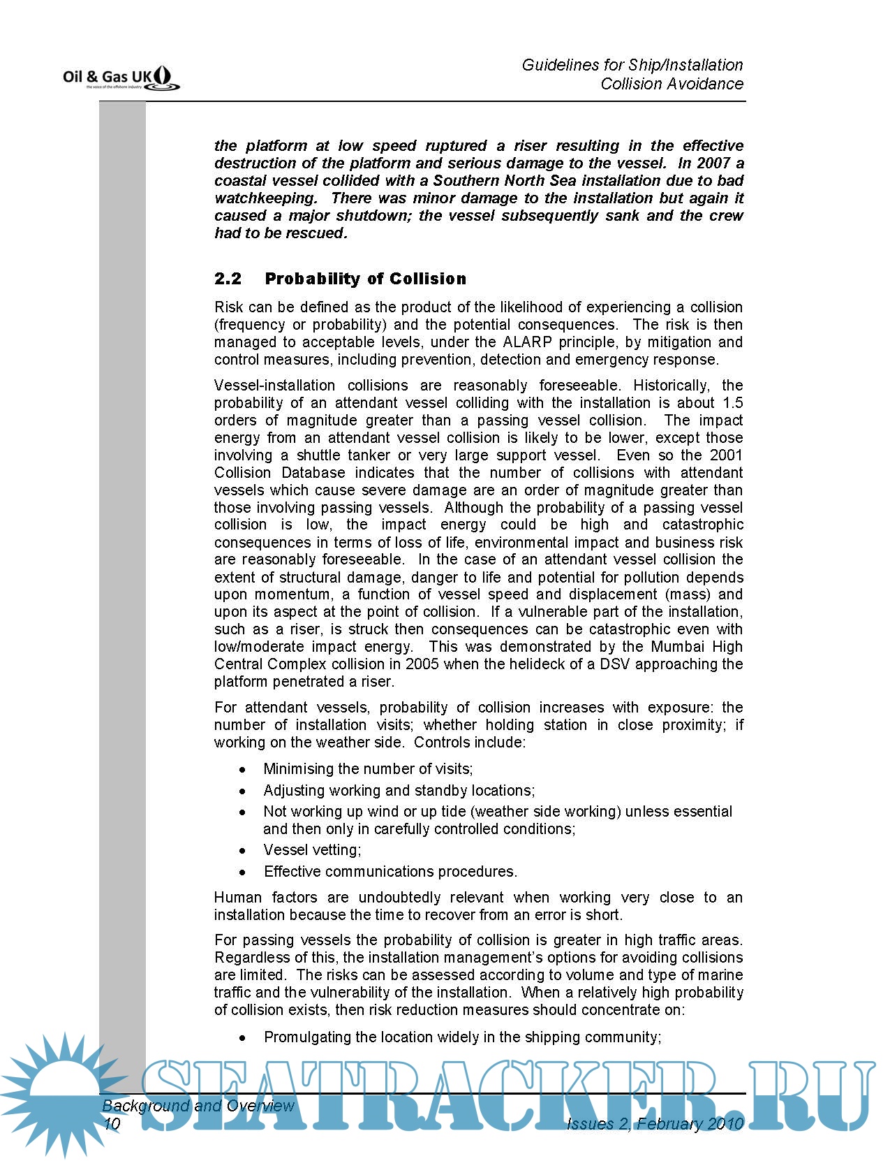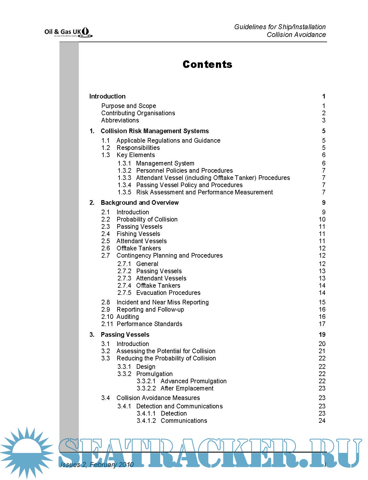 Year: 2010 Language: english Author: Oil & Gas UK Genre: Guide Publisher: Oil & Gas UK ISBN: 1 903 003 62 8 Format: PDF Quality: eBook Pages count: 83 Description: This document focuses on the reducing the risk of ship-installation collisions. Consequences are only considered insofar as they dictate timely appropriate response to imminent or actual impact. It gives guidance on good practice and suggests benchmarks against which to assess compliance. ALARP principles apply. Although procedures and equipment are suggested it is recognised that suitable alternatives for the situation of a particular field or installation may be acceptable. The document emphasises that equipment to achieve effective collision avoidance is safety critical and should be maintained as such. For the purposes of this document various vessel types are considered separately: passing vessels - those on route to somewhere else; attendant vessels - that is vessels with legitimate business at the installation; offtake tankers - a subset of attendant vessels, which interact with the installation in a specialised way and are therefore addressed in a dedicated section. Recommendations made in this guidance rely principally on checklists covering management systems, vessel suitability, self-audit and pre-operational checks – a form of risk assessment. They draw, wherever possible, on existing proven industry standards. The guidance is aimed principally at operations in the UK Sector, and hence refers to UK legislation, practices and organisations. Other administrations and national associations may wish to use its principles in their own Sectors.