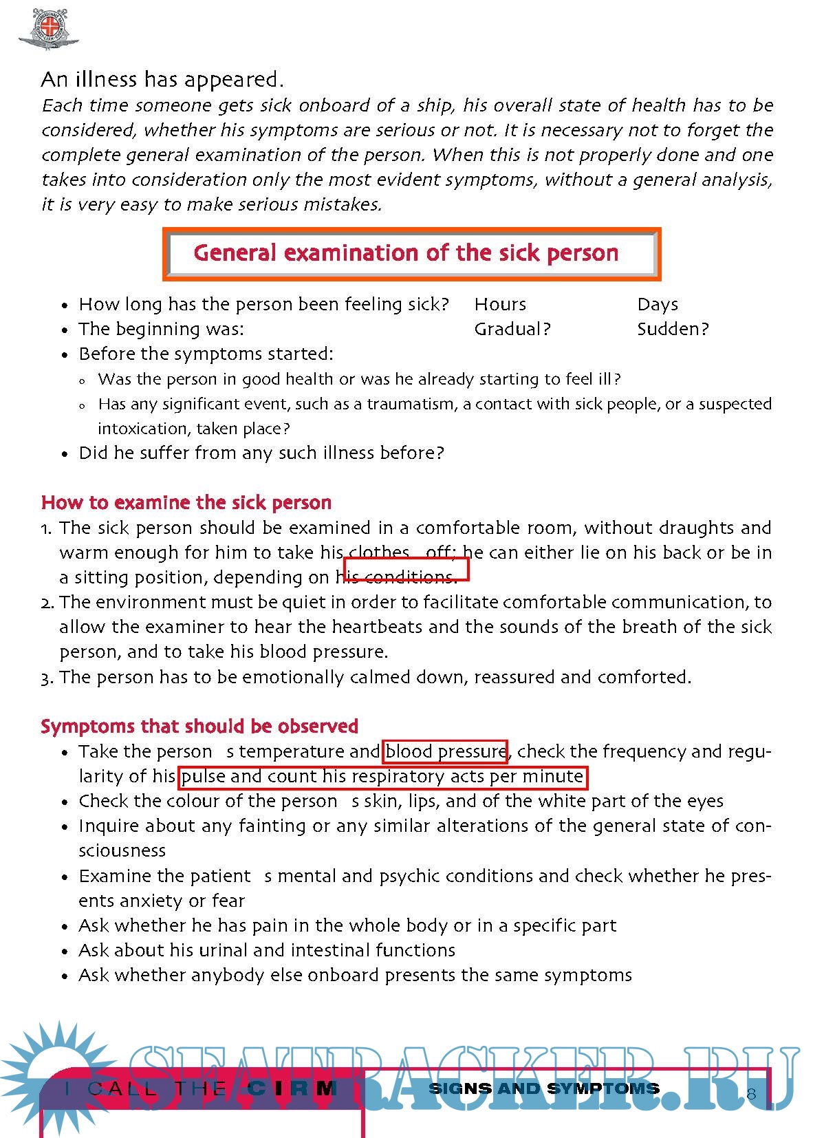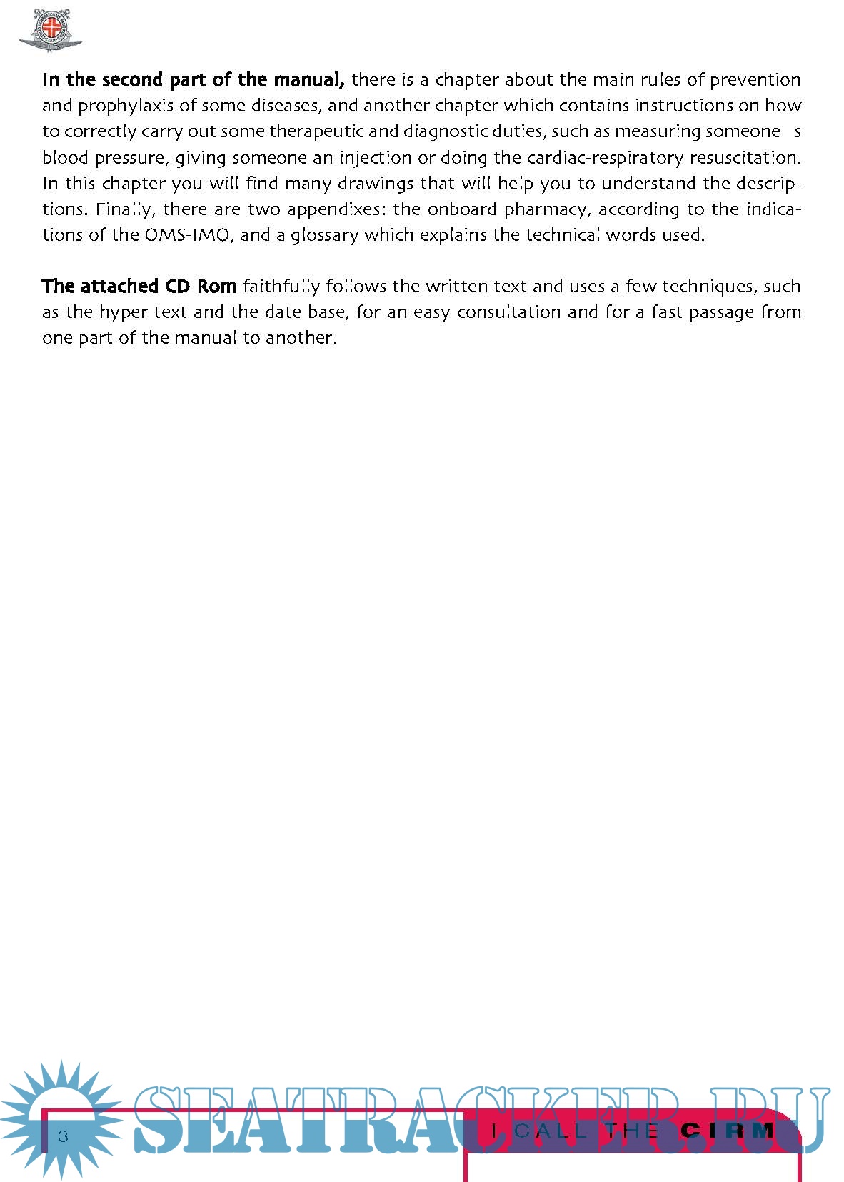 It is not a medical book at all, in fact technical words have been avoided. You will not find, in the index, the names of the diseases; there are no paragraphs about appendicitis , pneumonia , arm fracture and so on, but instead there is a list of the most common symptoms, such as fever , cough , or abdominal pain and a list of the most common types of injuries, such as traumatisms or intoxications . The experience of the CIRM teaches us that, onboard of a ship where there is no doctor, the best thing to do is examining carefully the starting symptoms of a disease or observing what type of accident has occurred, considering all the possibilities and intervening with caution so that the sick or injured person arrives to the harbour of destination in the best possible conditions.
