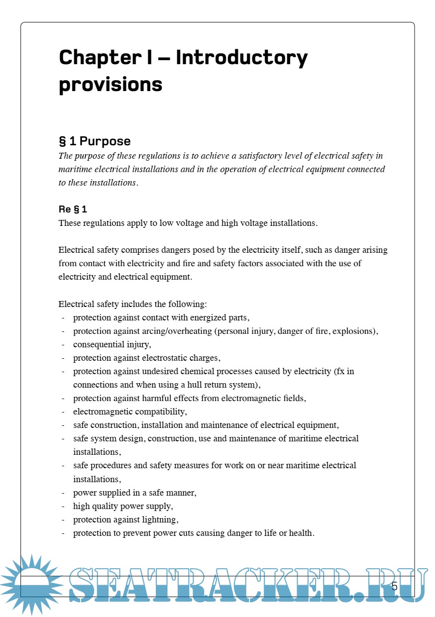 The purpose of these regulations is to achieve a satisfactory level of electrical safety in maritime electrical installations and in the operation of electrical equipment connected