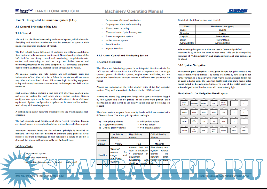 Year: 2010 Language: english Author: DSME Genre: Manual Format: PDF Quality: eBook Pages count: 319 Description: BARCELONA KNUTSEN is a LNG carrier built in 2010 by DAEWOO SHIPBUILDING & MARINE ENGINEERING CO. LTD. - GEOJE (KOR). YARD NO. 2267. Currently sailing under the flag of Spain. It's gross tonnage is 110920 tons and DWT 97730 tons. Tanks capacity 173650 cubic meters. Engine maker Wartsila 3 set Model 12V50DF 1 set Model 9L50df Output 11400 kW / 8550 at 514 rpm Voltage 6600 V 60 Hz It's gross tonnage is 110920 tons and DWT 97730 tons. Tanks capacity 173650 cubic meters