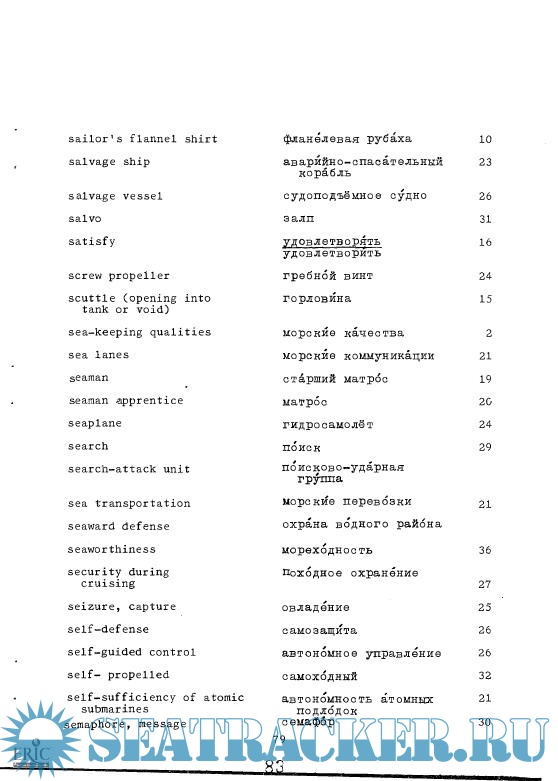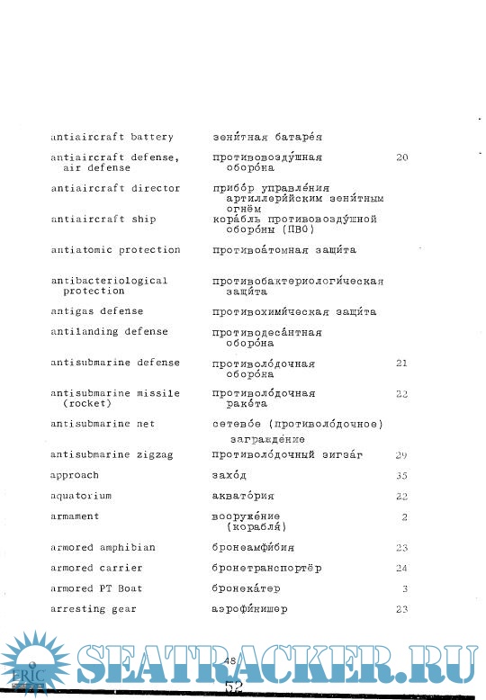 Year: 1971 Language: english, russian Author: Defense Language Institute Genre: Dictionary Publisher: Defense Language Institute Format: PDF Quality: Scanned pages Pages count: 106 Description: This dictionary is a companion to "Naval Terminology," developed by the Defense Language Institute and printed in 1971. Cyrillic script is usd for the Russian terminology. Two main sections define naval terms from Russian to English and from English to Russian. A list of abbreviations concludes the text.