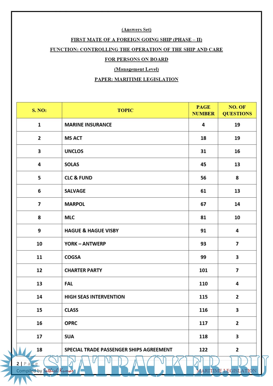 Year: 2023 Language: english Author: Sathish Kumar Format: PDF Quality: eBook Pages count: 146 Description: Solved Theory Answer set for: Subject: Maritime Legislation Grade: First Mate of a Foreign Going Ship ( Phase II) F.G. Mercantile Marine Department (MMD), India Examination Additional info: More Notes by same author: