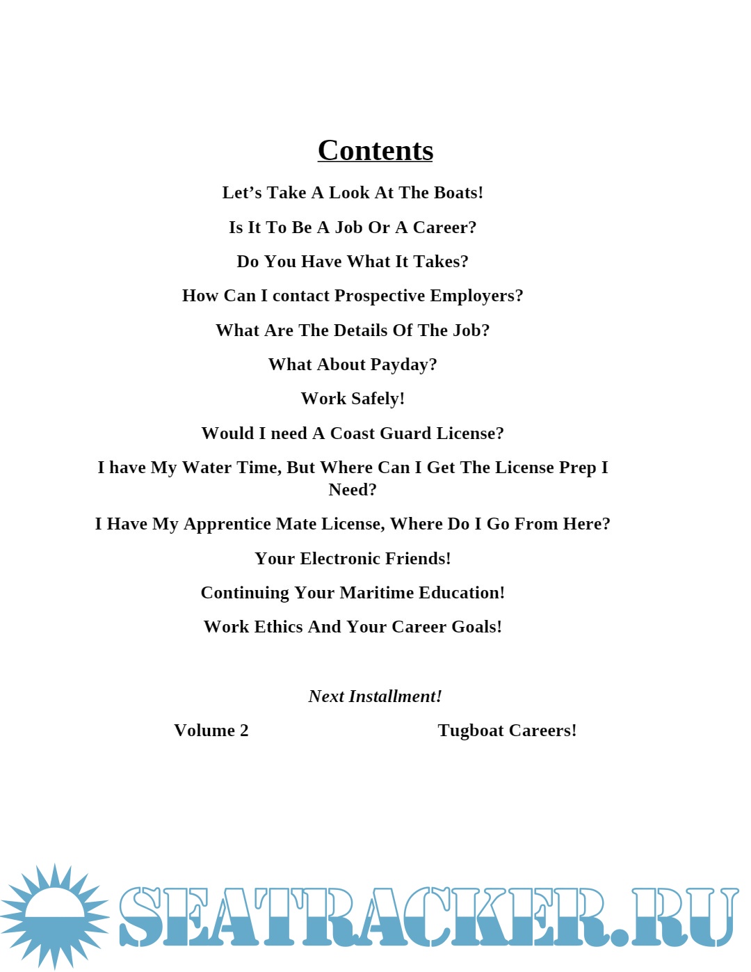 Description: This publication is written for the tugboat buff, and those interested in a career on tugboats. If you like to travel, get paid well for it, and have free meals and lodging away from home this may be the career for you! This career path can lead candidates with and without a college education to prestigious employment that can earn around $140K a year. Positions are available on the rivers and bays, or coastwise and ocean towing. If you are young and in good healtho without any real goals you should check out this career opportunity! The necessary information is all here to get started!