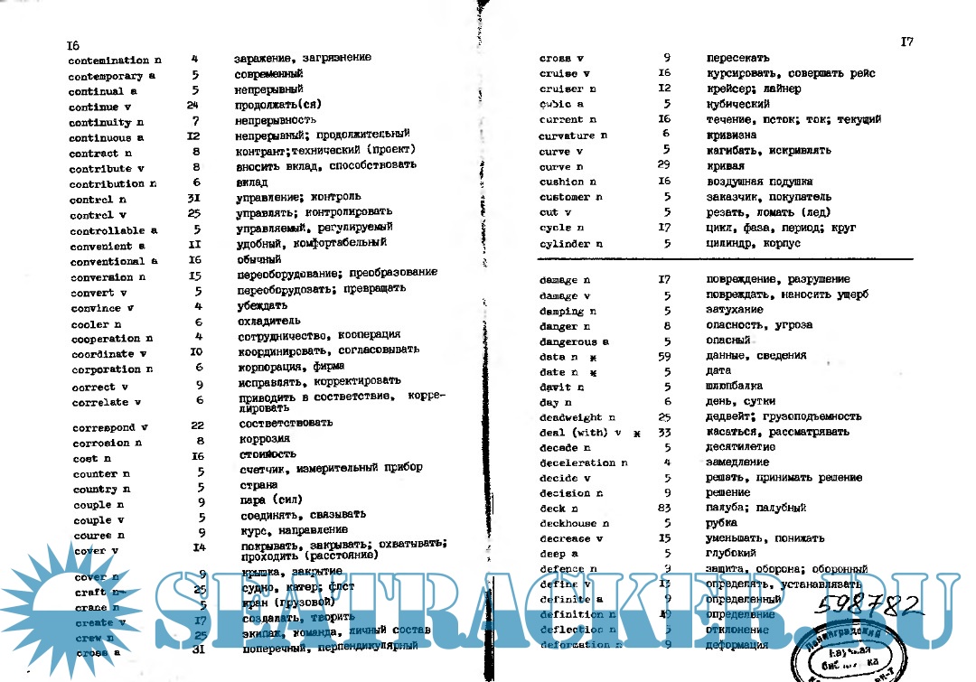 Год выпуска: 1989 Язык: английский / russian Автор: Будяковская Е. А. (сост.) Жанр: Methodological guide Издательство: ЛКИ Формат: DjVu Качество: Отсканированные страницы Количество страниц: 83 Описание: Настояние лексико-терминологические материалы предназначены для студентов, преподавателей, аспирантов и соискателей высших учебных заведений кораблестроительного профиля. Цель данного материала — помочь учащимся научиться читать оригинальную научно-техническую литературу на английском языке и вести беседу по своей специальности. Лексико-терминологические материалы состоят из двух разделов: алфавитно-частотного списка английских слов и их русских эквивалентов и частотного списка английских слов. Из-за ограниченного объема издания в данный список не включены имена собственные» личные местоимения, числительные, частицы, а также некоторые наречия с окончанием "ly", совпадающие по значению с исходным прилагательным, например: exact - точный, exactly - ТОЧНО. Настоящий список слов может рассматриваться как учебный лексический миницум, предназначенный для активного овладения студентами вузов кораблестроительного профиля. Пользуясь предлагаемым алфавитно-частотным списком, студенты могут приступать к чтению оригинальной литературы на английском языке с самого начала обучения в вузе. Разумеется» для этого
