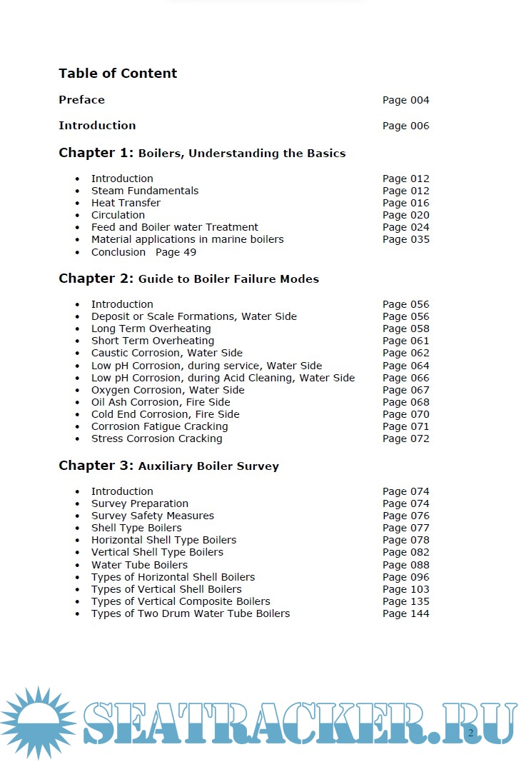 Year: 2006 Language: English Author: Kim Rolfsen Genre: Technical book Publisher: Det Norske Veritas Format: PDF Quality: eBook Pages count: 194 Description: Det Norske Veritas has experienced a number of incidents where different types of steam boilers have caused fatal accidents and material damages, especially involving oil fired auxiliary boilers older than ten years. Considering the severe consequences that equipment failure may have on crew’s safety and ship operations, steam boilers may represent a potentially high risk factor if improperly maintained. These poorly maintained boilers can result in furnace explosions, as well as rupturing of the pressurized parts. We have noted that some of our Surveyors need to increase their competence related to performance of boiler surveys. Based on this and the impression that competence related to boiler operation and maintenance is decreasing now days among seafarers, it was decided to develop this course.