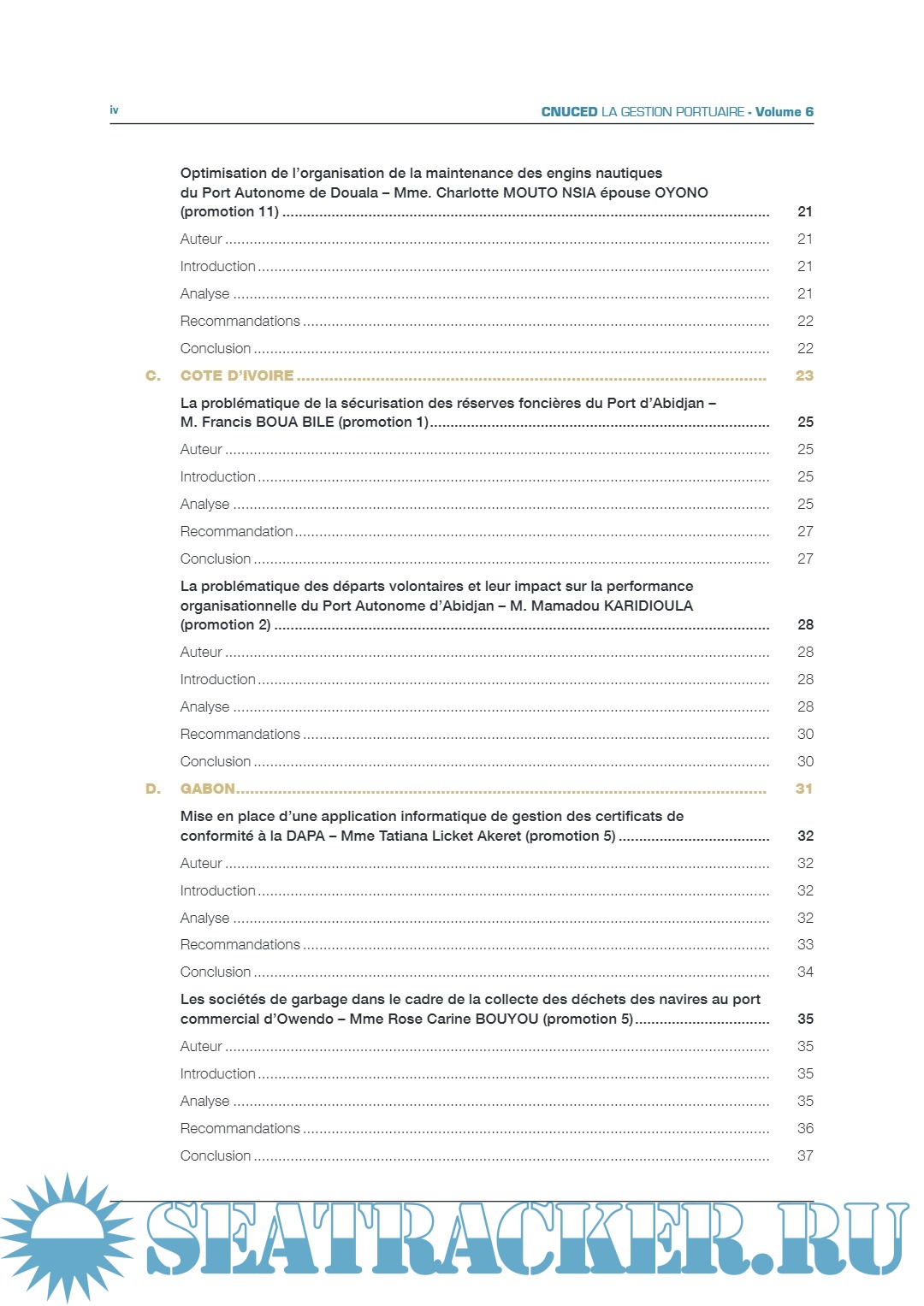 Description: Cette publication a été produite dans le cadre des activités du Programme de Gestion Portuaire TrainForTrade de la CNUCED. Elle a été financée par les ports du Bénin, Cameroun, Côte d’ivoire, Gabon, Guinée, Haïti, Sénégal et Togo. Ce projet a aussi reçu le soutien des grands ports maritimes de Nantes Saint-Nazaire et de Marseille- Fos (France). Les résumés des études de cas soumis par les participants de la formation composant cette publication ont été préparés par Elodie Bardin et Carine Fabre de l'institut de formation du Port de Marseille-Fos, Dominique Chantrel et Guillaume Marneffe, membres du personnel de la CNUCED, le tout encadré par Mark Assaf, Chef de la Section du développement des ressources humaines/TrainForTrade, sous la supervision de Geneviève Féraud, Chef du Service du développement des connaissances, et Shamika N. Sirimanne, Directeur de la Division des Transports et de la Logistique. Dans la présente publication, les termes pays/économie désignent, selon le cas, des territoires ou des zones. Les appellations employées et la présentation des données n’impliquent de la part du Secrétariat de l’Organisation des Nations Unies aucune prise de position quant au statut juridique des pays, territoires, villes ou zones ou de leurs autorités, ni quant au tracé de leurs frontières ou limites. La mention d’une société et de ses activités ne doit pas être interprétée comme une marque de soutien de la part de la CNUCED à cette société ou à ses activités. Le texte de la présente publication peut être cité ou reproduit, sous réserve qu’il soit fait mention de la source et qu’un exemplaire de la publication où sera reproduit l’extrait cité soit communiqué au secrétariat de la CNUCED. Le présent document n’a pas fait l’objet d’une relecture par les services d’édition.