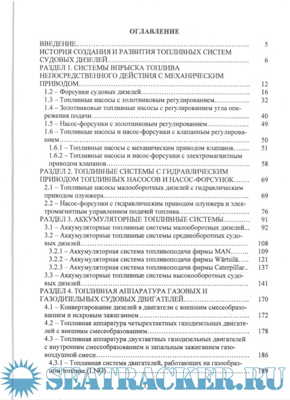 Оглавление Введение.............................................................................................. 5 История создания и развития топливных систем судовых дизелей ................................................................................. 6 РАЗДЕЛ 1. СИСТЕМЫ ВПРЫСКА ТОПЛИВА НЕПОСРЕДСТВЕННОГО ДЕЙСТВИЯ С МЕХАНИЧЕСКИМ ПРИВОДОМ ....................................................................................... 12 1.2. - Форсунки судовых дизелей .................................................. 16 1.3. - Топливные насосы с золотниковым регулированием ......... 32 1.4. - Золотниковые топливные насосы с регулированием угла опережения подачи ................................................................... 40 1.5. Насос-форсунки с золотниковым регулированием ............... 49 1.6. - Топливные насосы и насос-форсунки с клапанным регулированием .......................................................... 50 1.6.1. - Топливные насосы с механическим приводом клапанов ........................................................................... 51 1.6.2. - Топливные насосы и насос-форсунки с электромагнитным приводом клапанов ........................................ 58 РАЗДЕЛ 2. ТОПЛИВНЫЕ СИСТЕМЫ С ГИДРАВЛИЧЕСКИМ ПРИВОДОМ ТОПЛИВНЫХ НАСОСОВ И НАСОС - ФОРСУНОК ...... 69 2.1. - Топливные насосы малооборотных дизелей с гидравлическим приводом плунжера ............................................... 69 2.2. - Насос-форсунки с гидравлическим приводом плунжера и электромагнитным управлением подачей топлива ...................... 76 РАЗДЕЛ 3. АККУМУЛЯТОРНЫЕ ТОПЛИВНЫЕ СИСТЕМЫ ............... 91 3.1. Аккумуляторные топливные системы малооборотных дизелей .................................................................... 92 3.2. Аккумуляторные топливные системы среднеоборотных дизелей ............................................................... 108 3.2.1. - Аккумуляторная система топливоподачи фирмы MAN ... 109 3.2.2. - Аккумуляторная система топливоподачи фирмы Wartsila ............................................................................................... 121 3.2.3. - Аккумуляторная система топливоподачи фирмы Caterpillar ........................................................................................... 137 3.3. - Аккумуляторные топливные системы высокооборотных дизелей ............................................................................................... 141 РАЗДЕЛ 4. ТОПЛИВНАЯ АППАРАТУРА ГАЗОВЫХ И ГАЗОДИЗЕЛЬНЫХ СУДОВЫХ ДИЗЕЛЕЙ ............................................170 4.1. - Конвертирование дизелей в двигатели с внешним смесеобразованием и искровым зажиганием ............... 172 4.2. - Топливная аппаратура четырехтактных газодизельных двигателей с внешним смесеобразованием ........... 178 4.3. - Топливная аппаратура двухтактных газодизельных двигателей с внутренним смесеобразованием и запальным зажиганием газовоздушной смеси .................................................... 186 4.3.1. - Топливная система двигателей, работающих на газообразном топливе (LNG) ............................................................ 189 4.3.2. - Топливная система двигателей, работающих на сжиженном нефтяном газе (LPG) ..................................................... 197 РАЗДЕЛ 5. ПОКАЗАТЕЛИ РАБОТЫ ТОПЛИВНОЙ АППАРАТУРЫ СОВРЕМЕННЫХ ДИЗЕЛЕЙ И ИХ ВЛИЯНИЕ НА РАБОЧИЙ ПРОЦЕСС ДВИГАТЕЛЯ ...................................................................... 202 5.1. - Процесс впрыска и распыливания топлива ......................... 202 5.1.1. - Стадии и макроскопические параметры процесса впрыска, их влияние на смесеобразование в дизелях .................... 203 5.1.2. - Микроскопические параметры процесса впрыска, их влияние на смесеобразование и сгорание в дизелях ...................... 212 5.2. - Гидродинамические процессы в системе топливоподачи ... 222 5.2.1. - Характеристика давления впрыска .................................... 226 5.2.2. - Характеристика впрыскивания топлива ............................. 233 5.3. - Влияние процесса топливоподачи на рабочий процесс дизеля .................