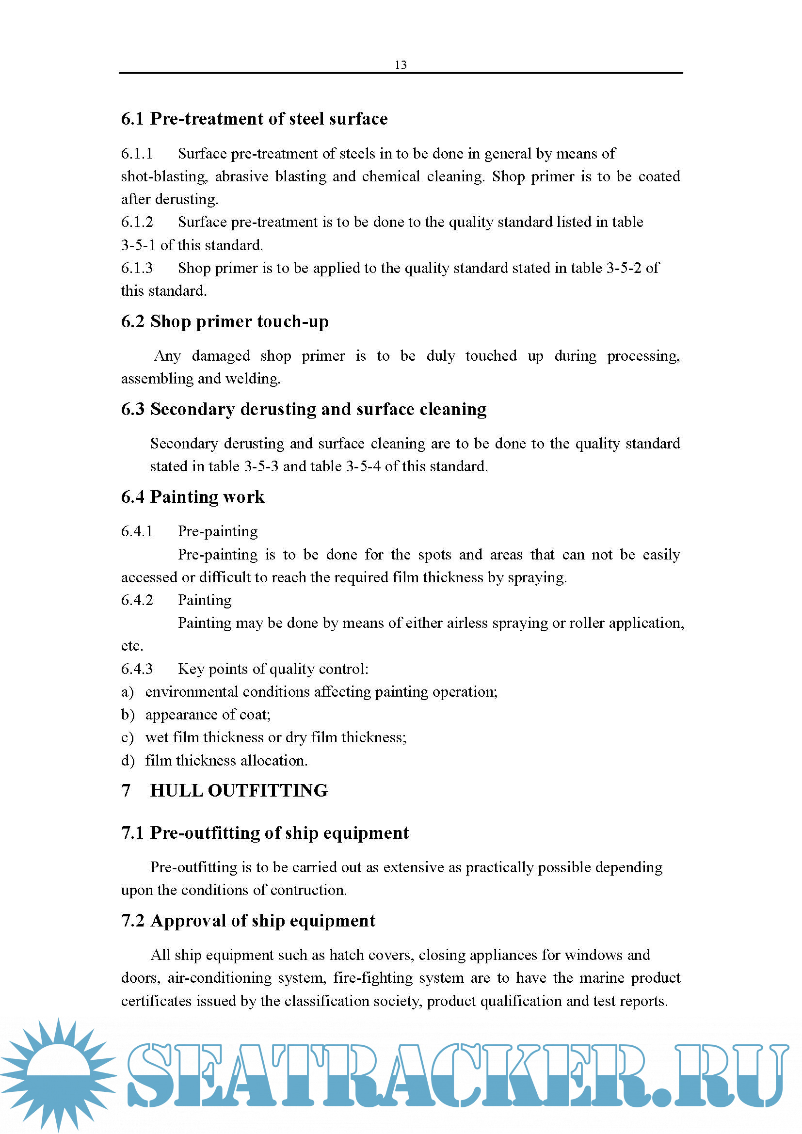 CONTENTS PART 1 QUALITY CONTROL THROUGH PRODUCTION 1 STEEL MATERIAL AND PROCESSING………………………………………6 1.1 Steel material…………………………………………………………………… ..6 1.2 Steel processing………………………………………………………… ………...6 2 FIXING AND ASSEMBLING……………………………………………………7 2.1 Fixing and assembling of parts and members………………………………….…7 2.2 Block assembling…………………………………………………………………7 3 WELDING……………………………………………………………………….8 3.1 Preparation before welding……………………………………………….………8 3.2 Welding process………………………………………………………………….8 3.3 Welding inspection……………………………………………………………….8 3.4 Key points of quality control……………………………………………………..9 4 TIGHTNESS TEST………………………………………………………………..9 5 FABRICATION,FIXING,TIGHTNESS TESTING AND FLUSHING OF PIPES………………………………………………………………………………10 5.1 Fabrication of pipes………………………………………………………..…….10 5.2 Fixing of pipes and fittings…………………………………………………… .11 5.3 Tightness testing of piping system……………………………………………....12 5.4 Flushing of pipes…………………………………………………………………12 6 PAINTING………………………………………………………………...………13 6.1 Pre-treatment of steel surface……………………………………………………13 6.2 Shop primertouch-up………………………………………………………….....13 6.3 Secondary derusting and surface cleaning…………………………………...….13 6.4 Painting work…………………………………………………………………..13 7 HULL OUTFITTING……………………………………………………………13 7.1 Pre-outfitting of ship equipment…………………………………………………13 7.2 Approval of ship equipment……………………………………………………...13 7.3 Installation of ship equipment……………………………………………………14 7.4 Key points of quality control…………………………………………………….14 8 MACHINERY INSTALLATION……………………………………………….15 8.1 Shafting and propeller…………………………………………………………..15 8.2 Main engine and accessories……………………………………………………17 8.3 Auxiliary machinery…………………………………………………………….18 8.4 Boiler……………………………………………………………………………19 9 ELECTRIC INSTALLATION………………………………………………….19 9.1 Electric fittings………………………………………………………………….19 9.2 Cable laying……………………………………………………………………..20 9.3 Installation and earthing of electric equipment…………………………………20 9.4 Connection and earthing of metal covering of cables…………………………..21 10 AUTOMATIC CONTROL AND REMOTE CONTROL,TELEMETRY EQUIPMENT AND THEIR TESTING……………………………………….…21 10.1 Sensors………………………………………………………………………...21 10.2 Automatic control and remote control…………………………………….…..22 10.3 Monitoring and alarming………………………………………………….…..22 10.4 Test of unattended engine room…………………………………………….…23 11 MOORING TEST AND SEA TRIAL………………………………………..23 11.1 Mooring test and sea trial for hull part………………………………………..23 11.2 Mooring test and sea trial for machinery part…………………………….…...24 11.3 Mooring test and sea trial for electric part………………………………….…25 12 COMPLETION AND DELIVERY…………………………………………..25 12.1 Delivery of cabin equipment, spares and supplies……………………………25 12.2 Inspection of marking and operation instructions……………………………...25 12.3 As-built drawings and ship delivery documents………………………………26 12.4 Certificates to be handed over…………………………………………………26 PART 2 PLANS FOR APPROVAL AND INSPECITIONS AND TESTS FOR ACCEPTANCE 1 PLANS FOR APPROVAL……………………………………………………..27 1.1 General ……………………………………………………………………….27 1.2 Plans and documents to be submitted for review and approval………………27 2 INSPECTIONS AND TESTS FOR ACCEPTANCE……………………..32 2.1 General……………………………………………………………………….32 2.2 Items of inspection and tests………………………………………………….33
