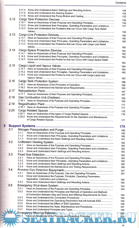 Acknowledgements Introduction 1 Fundamental Knowledge and Understanding . 1.1 Physics and Chemistry . 1.1.1 Have an Awareness of the Physics Relating to the Change of State of Fluids . 1.1.2 Know and Understand the `Gas Laws' and how they are Applicable to LNG Operations 1.1.3 Know and Understand the Physics Relating to the Change of State of the Various Components Involved in Relation to LNG 1.1.4 Know and Understand the Principles Involved in the Changing of Tank Atmospheres . 1.1.5 Have an Awareness of the Parameters for Inert Gas 1.1.6 The Meaning of `Dew Point'. 1.1.7 Know and Understand the Principles Used During the Tank Cool-Down Process 1.2 Principles of Design 1.2.1 Have an Awareness of Main Design Principles . 1.2.2 Know and Understand the Main Design Principles . 1.3 Regulations and Guidance . 1.3.1 Have an Awareness of the Applicable Regulations . 1.3.2 Know the Relevant Regulatory Requirements for Containment System and Cargo Related Operations . 1.3.3 Have an Awareness of Industry and Organisational Guidance Publications Available 1.3.4 Have an Awareness of Industry Sources of Guidance and Advice 1.4 Principles of Tank Atmospheres . 1.4.1 Know the Definitions Relating to Tank Atmospheres . 1.5 Properties of Materials 1.5.1 Have an Awareness of the Materials that are Used in the Construction of LNG Carriers and their Properties that Make them Suitable for Use . 1.5.2 Know and Understand the Materials that are Used in the Construction of LNG Carriers . 1.6 Hazards of LNG and Relevant Gases 1.6.1 Have an Awareness of the Hazards to Personnel and the Ship from LNG and Relevant Gases 1.6.2 Know and Understand the Hazards to Personnel and the Ship from LNG and Relevant Gases and the Defences Applied . 1.6.3 Know the First Aid Action to be Taken in the Event of Personnel Contact with LNG 1.6.4 Have an Awareness of LNG Fire-Fighting Techniques and Equipment. 1.6.5 Know and Understand LNG Fire-Fighting Techniques and Equipment . 1.7 Environmental Impact . 1.7.1 Have an Awareness of the Potential Environmental Impact of LNG Operations . 1.7.2 Know and Understand the Potential Environmental Impact of LNG Operations . 1.8 Risk Assessment 1.8.1 Have an Awareness of the Requirement to Carry Out Risk Assessments 1.8.2 Know and Understand the Process to Carry Out Risk Assessments of Planned Operations . 1.9 Individual Responsibilities 1.9.1 Have an Awareness of Own Responsibilities 1.9.2 Know and Understand Own and Others Individual Responsibilities 1.10 Contingency Plans 1.10.1 Have an Awareness of their Purpose and Principles. 1.10.2 Know and Understand the Contingency Planning Process . 1.11 Record Keeping 1.11.1 Have an Awareness of the Requirements . 1.11.2 Know and Understand the Requirements for Record Keeping 1.12 Planning 1.12.1 Know and Understand the Stages of the Planning Process 2 Equipment 2.1 Cargo System Tank Construction 2.1.1 Have an Awareness of the Moss Type 2.1.2 Know and Understand the Moss Type. 2.1.3 Have an Awareness of the Membrane Type 2.1.4 Know and Understand the Membrane Type 2.1.5 Have an Awareness of the SPB (Self-supporting, Prismatic Shape, IMO Type-B) Type . 2.1.6 Have an Awareness of the Differences Between Moss, Membrane and SPB Types . 2.2 Air and Inert Gas Driers 2.2.1 Have an Awareness of their Purpose and Operating Principles 2.2.2 Know and Understand their Operating Parameters and Limitations . 2.2.3 Know and Understand Likely Problems. 2.2.4 Know and Understand Operational Requirements and Procedures 2.3 Inert Gas Generator 2.3.1 Have an Awareness of its Purpose and Operating Principles . 2.3.2 Know and Understand their Operating Parameters and Limitations . 2.3.3 Know and Understand Operational Requirements and Procedures 2.3.4 Know and Understand Alarm Settings and Resulting Actions . 2.4 Nitrogen Systems . 2.4.1 Have an Awareness of their Purpose, the Different Types and their Operating Principles 2.4.2 Know and Understand Nitrogen Generator Operating Principles and Parameters, the Outlet Requirements and Limitations 2.4.3 Know and Understand Operational Requirements and Procedures 2.4.4 Know and Understand Bulk Liquid Nitrogen Storage Systems . 2.4.5 Know and Understand Alarm Settings and Resulting Actions . 2.5 LNG Vaporiser 2.5.1 Have an Awareness of its Purpose and Operating Principles . 2.5.2 Know and Understand its Principles, Operating Parameters, the Outlet Requirements and Limitations . 2.5.3 Know and Understand Operational Requirements and Procedures 2.5.4 Know and Understand Alarm Settings and Resulting Actions . 2.6 High Duty Compressor(s) . 2.6.1 Have an Awareness of their Purpose and Operating Principles 2.6.2 Know and Understand Design Features 2.6.3 Know and Understand Operational Requirements and Procedures 2.6.4 Know and Understand Alarm Settings and Resulting Actions . 2.7 Low Duty Compressor(s) 2.7.1 Have an Awareness of their Purpose and Operating Principles 2.7.2 Know and Understand Design Features 2.7.3 Know and Understand Operational Requirements and Procedures 2.7.4 Know and Understand Alarm Settings and the Resulting Actions . 2.8 Gas Heaters . 2.8.1 Have an Awareness of their Purpose and Operating Principles 2.8.2 Know and Understand their Principles, Operating Parameters, the Outlet Requirements and Limitations . 2.8.3 Know and Understand Operational Requirements and Procedures 2.8.4 Know and Understand Alarm Settings and Resulting Actions . 2.9 Forcing Vaporiser . 2.9.1 Have an Awareness of its Purpose and Operating Principles . 2.9.2 Know and Understand its Principles, Operating Parameters, the Outlet Requirements and Limitations . 2.9.3 Know and Understand Operational Requirements and Procedures 2.9.4 Know and Understand Alarm Settings and Resulting Actions . 2.10 Cargo Pumps 2.10.1 Have an Awareness of their Purpose and Operating Principles 2.10.2 Know and Understand their Principles, Operating Parameters and Limitations 2.10.3 Know and Understand Operational Requirements and Procedures 2.10.4 Know and Understan