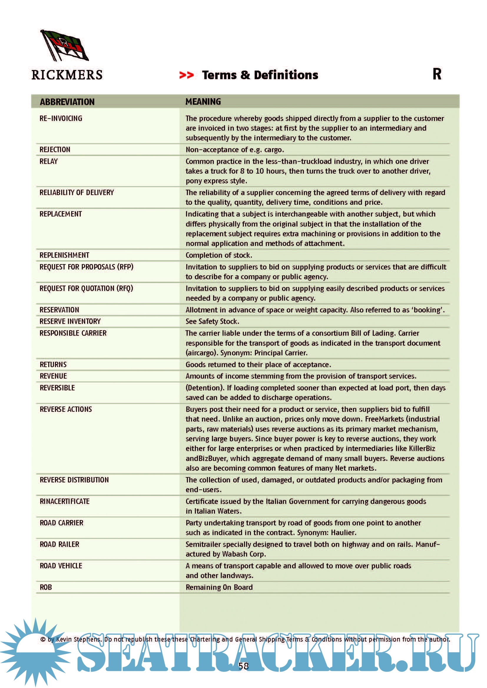 Year: 2007 Language: english Author: Kevin Stephens (Rickmers-Linie) Genre: Practical guide Publisher: Rickmers-Linie [Hamburg] Format: PDF Quality: eBook Pages count: 76 Description: This document contents a non-exhaustive list of frequently used chartering and general shipping abbreviations and their definitions that you may come across from time to time.