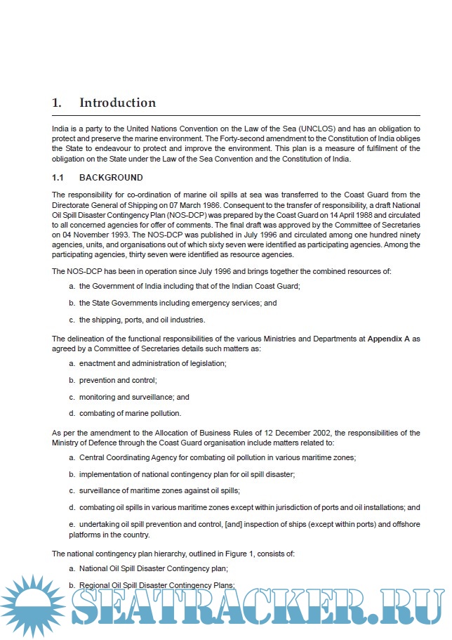Year: 2015 Language: english Author: Ministry of Defense, Govt. of India Genre: Handbook Format: PDF Quality: eBook Pages count: 62 Description: The National Oil Spill Disaster Contingency Plan or NOS-DCP for short, together with the allocation of functional responsibilities to the various Ministries and Departments of the Government of India for oil spill response in the maritime zones of India was approved by a Committee of Secretaries to the Government of India on 04 November 1993. The NOS-DCP was originally promulgated in July 1996 and subsequently updated in 1998, 1999, 2000, 2002 and 2006 to include additional information. This 2014 edition of the NOS-DCP has been completely revised to reflect current international norms and best practices, key relevant national regulations, experience gained since publication of the first edition in July 1996 and valuable inputs received from stakeholders to the national plan as part of the process of revision. The NOS-DCP was originally designed for responding to oil spill disasters in Indian waters. However, in view of India being in the process of acceding to the OPRC-HNS Protocol of 2000, this 2014 edition of the NOS-DCP has been revised in a manner such as to facilitate national preparedness and response to HNS incidents also and thereby fulfil India’s obligation to have in place a national plan to respond to HNS incidents, as a State party to the OPRC-HNS Protocol. By an Office Memorandum of the Ministry of Defence dated 07 March 1986 and further, by amendment to the Government of India (Allocation of Business) Rules, 1961vide Gazette notification dated 12 December 2002, the Indian Coast Guard has been designated as the Central Coordinating Authority for combating oil spills in Indian waters and undertaking oil spill prevention and control.